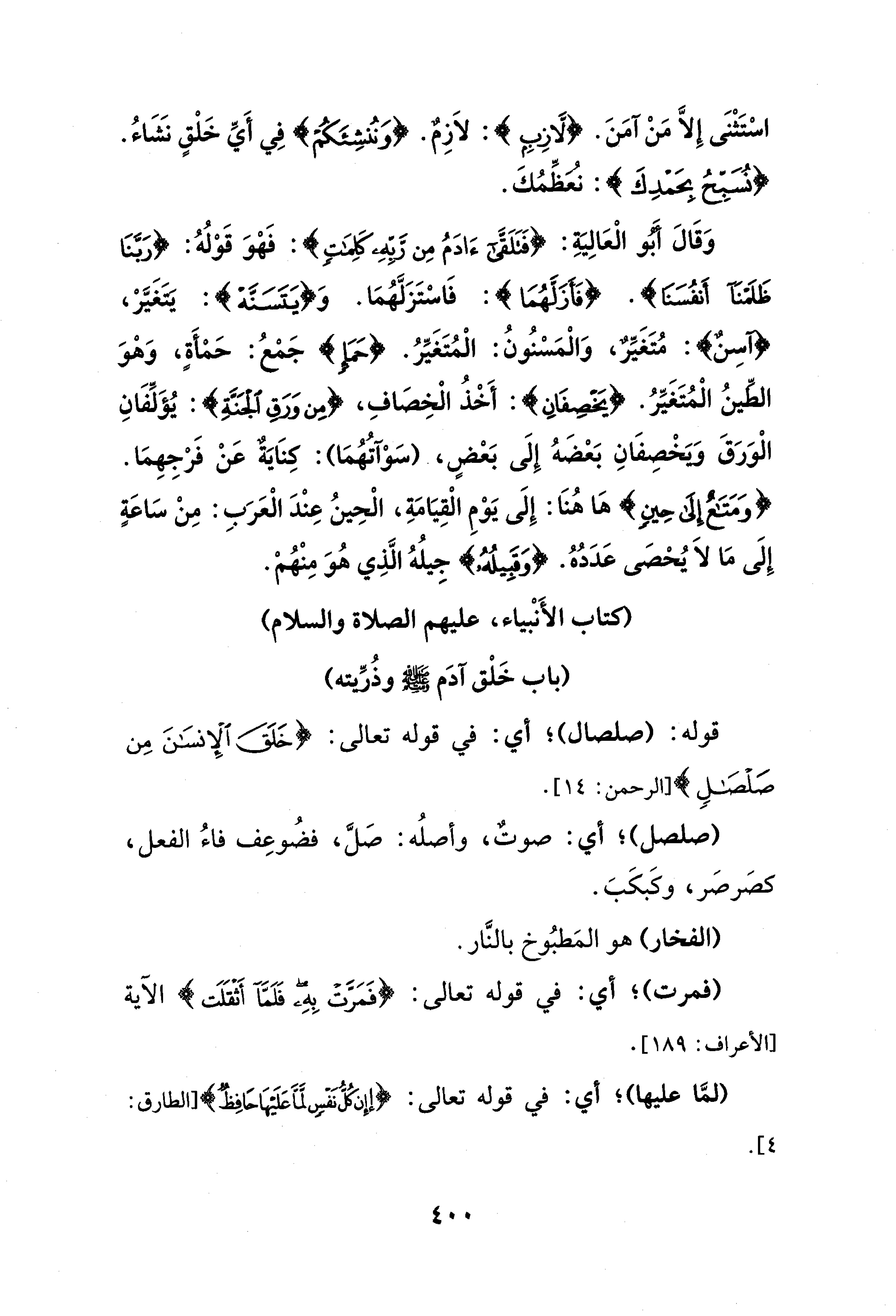 وَقَالَ أَبو الْعَالِيةِ: {فَتَلَقَّى آدَمُ مِنْ رَبِّهِ كَلِمَاتٍ}: فَهْوَ قَوْلُهُ: {ربنَا ظَلَمنا أَنفُسَنا}. {فأزَلَّهُما}: فَاسْتَزَلَّهُمَا. وَ {يَتسَنَّهْ}: يتغَيَّرْ، {آسِنٌ}: مُتَغَيِّرٌ، وَالْمَسْنُونُ: الْمُتَغَيِّرُ. {حمإ} جَمعُ: حَمأَةٍ، وَهْوَ الطينُ الْمُتَغَيِّرُ. {يخصفَانِ}: أَخْذُ الْخِصَافِ، {مِن وَرَق الجنَّةِ}: يُؤَلِّفَانِ الْوَرَقَ وَيَخْصِفَانِ بَعْضَهُ إِلَى بَعضٍ، (سَوْآتُهُمَا): كنَايَةٌ عَنْ فَرْجِهِمَا. {وَمَتَاعٌ إِلَى حِينٍ} هاهُنَا: إِلَى يَوْمِ الْقِيَامَةِ، الْحِينُ عِنْدَ الْعَرَبِ: مِنْ سَاعَةٍ إِلَى مَا لاَ يُحْصَى عَدَدُهُ. {وَقَبيلُهُ} جِيلُهُ الَّذِي هُوَ مِنْهُم.