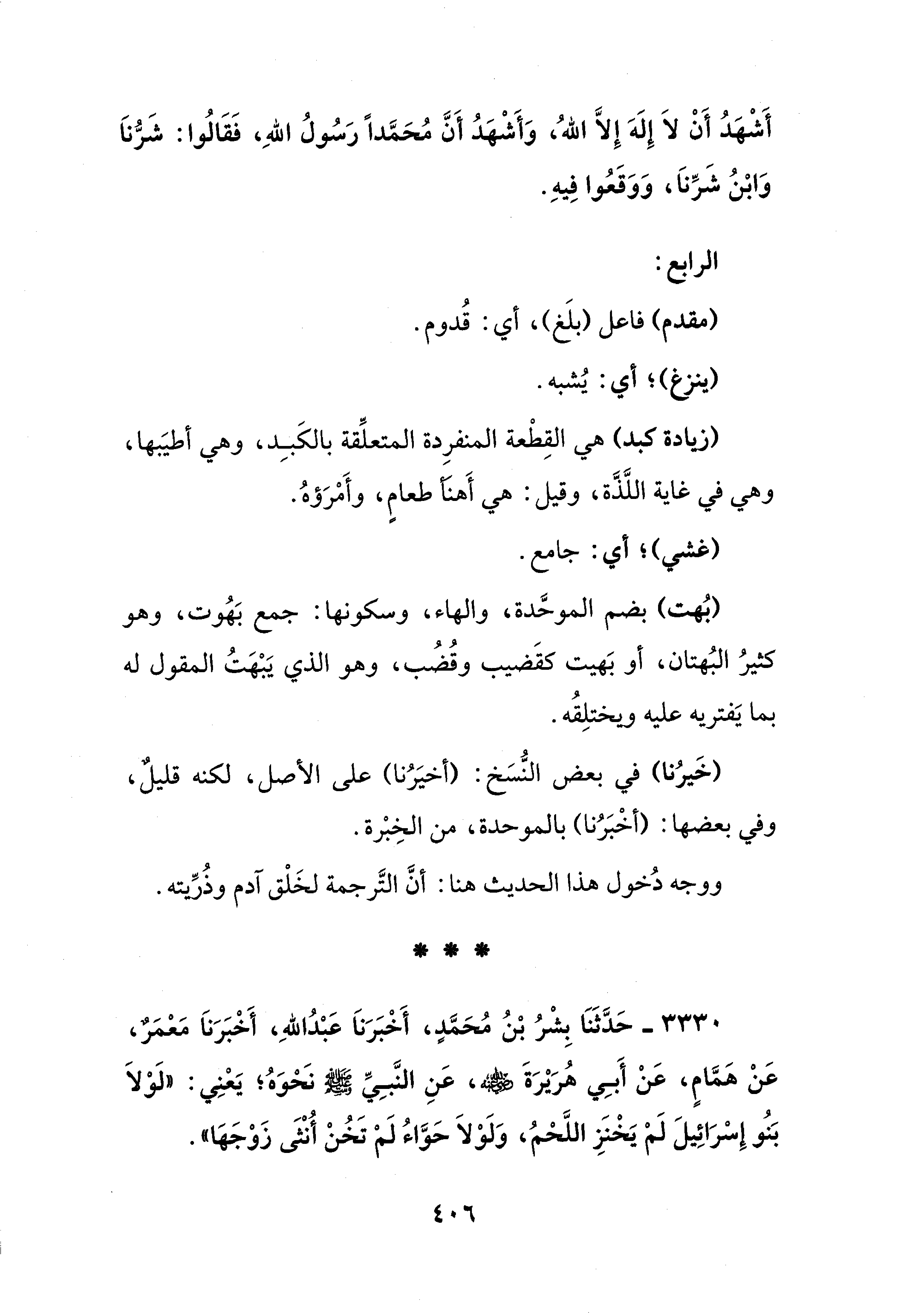 3330 - حَدَّثَنَا بِشْرُ بْنُ مُحَمَّدٍ، أَخْبَرَنَا عَبْدُ اللهِ، أَخْبَرَنَا مَعْمَرٌ، عَنْ همَّامٍ، عَنْ أَبِي هُرَيْرَةَ - رضي الله عنه -، عَنِ النَّبِيِّ - صلى الله عليه وسلم - نَحْوَهُ؛ يَعْنِي: "لَوْلاَ بَنُو إِسْرَائِيلَ لم يَخْنَزِ اللَّحْمُ، وَلَوْلاَ حَوَّاءُ لَمْ تَخُنْ أُنْثَى زَوْجَها".