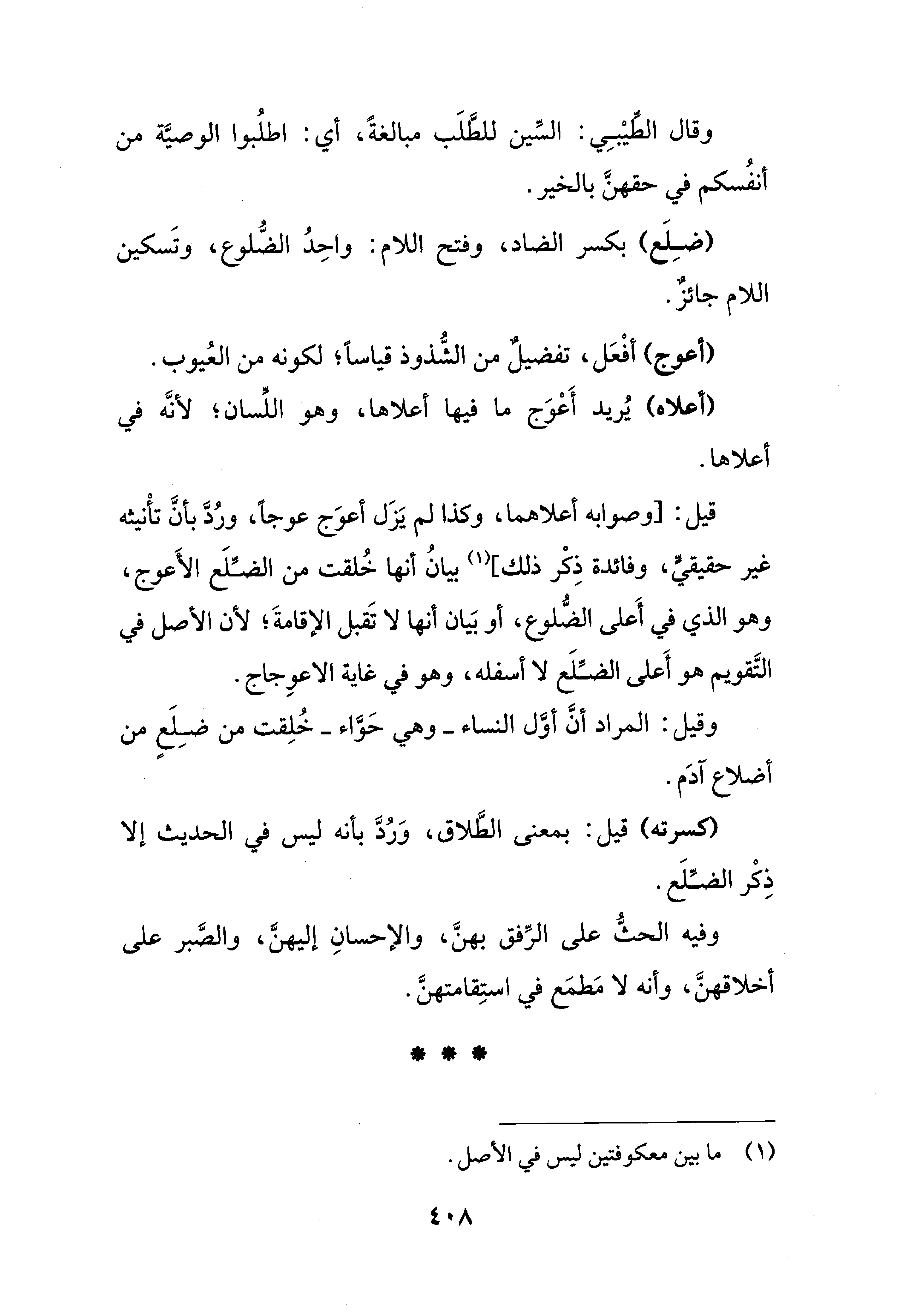 قيل: [وصوابه أعلاهما، وكذا لم يَزَل أعوَج عوجًا، ورُدَّ بأنَّ تأْنيثه غير حقيقيٍّ، وفائدة ذِكْر ذلك] (¬1) بيانُ أنها خُلقت من الضِّلَع الأَعوج، وهو الذي في أَعلى الضُّلوع، أو بَيان أنها لا تَقبل الإقامةَ؛ لأن الأصل في التَّقويم هو أَعلى الضِّلَع لا أسفله، وهو في غاية الاعوِجاج.