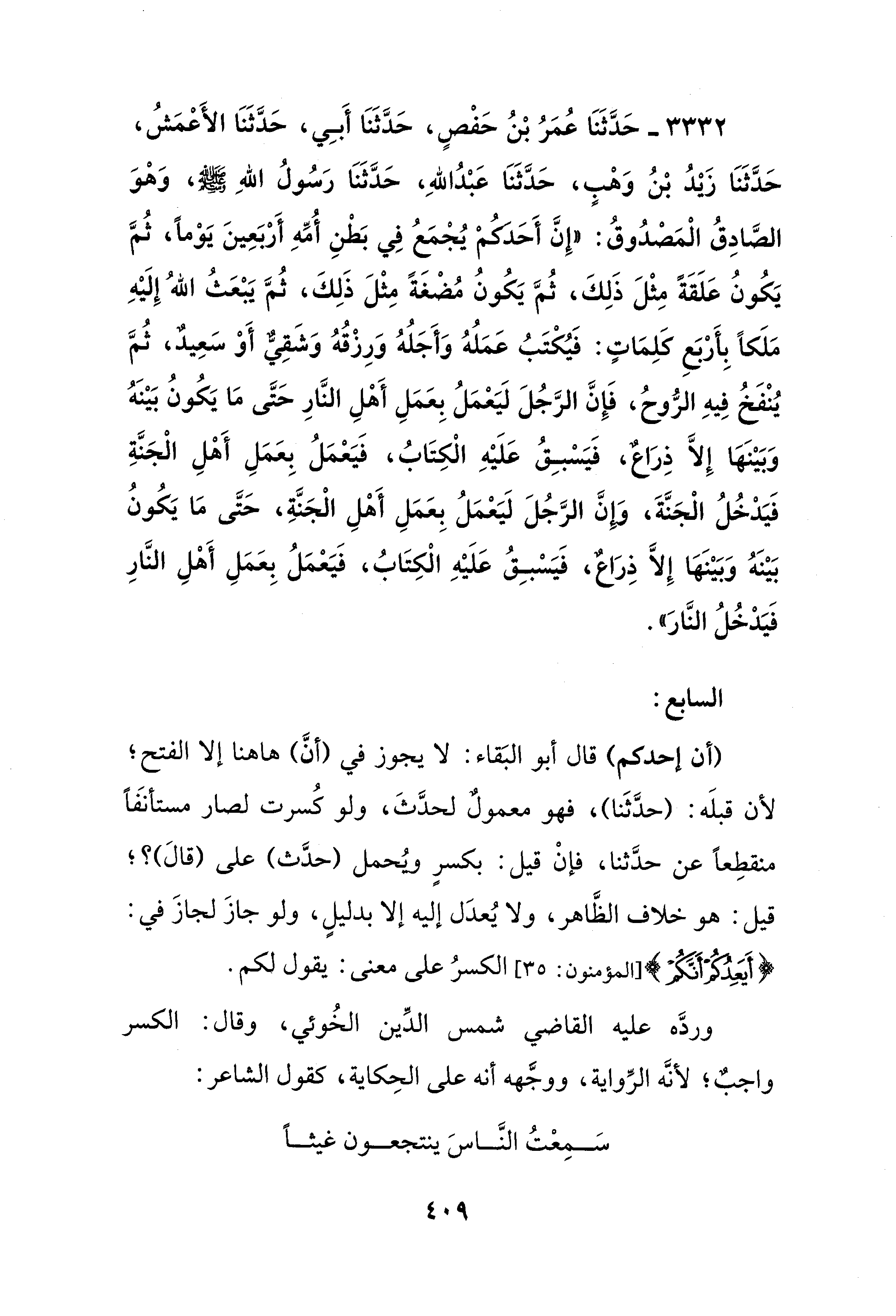 3332 - حَدَّثَنَا عُمَرُ بْنُ حَفْصٍ، حَدَّثَنَا أَبِي، حَدَّثَنَا الأعْمَشُ، حَدَّثَنَا زَيْدُ بْنُ وَهْبٍ، حَدَّثَنَا عَبْدُ اللهِ، حَدَّثَنَا رَسُولُ اللهِ - صلى الله عليه وسلم -، وَهْوَ الصَّادِقُ الْمَصْدُوقُ: "إِنَّ أَحَدكم يُجْمَعُ فِي بَطْنِ أُمِّهِ أرْبَعِينَ يَوْمًا، ثُمَّ يَكُونُ عَلَقَةً مِثْلَ ذَلِكَ، ثُمَّ يَكُونُ مُضْغَةً مِثْلَ ذَلِكَ، ثُمَّ يَبْعَثُ اللهُ إِلَيْهِ مَلَكًا بِأَرْبَعِ كَلِمَاتٍ: فَيُكْتَبُ عَمَلُهُ وَأَجَلُهُ وَرِزْقُهُ وَشَقِيٌّ أَوْ سَعِيدٌ، ثُمَّ يُنْفَخُ فِيهِ الرُّوحُ، فَإِنَّ الرَّجُلَ لَيَعْمَلُ بِعَمَلِ أَهْلِ النَّارِ حَتَّى مَا يَكُونُ بَيْنَهُ وَبَيْنَها إِلَّا ذِرَاعٌ، فَيَسْبِقُ عَلَيْهِ الْكِتَابُ، فَيَعمَلُ بِعَمَلِ أَهْلِ الْجَنَّةِ فَيَدخُلُ الْجَنَّةَ، وَإِنَّ الرَّجُلَ لَيعمَلُ بِعَمَلِ أَهْلِ الْجَنَّةِ، حَتَّى مَا يَكُونُ بَيْنَهُ وَبَيْنَها إِلَّا ذِرَاعٌ، فَيَسْبِقُ عَلَيْهِ الْكِتَابُ، فَيَعْمَلُ بِعَمَلِ أَهْلِ النَّارِ فَيدخُلُ النَّارَ".
