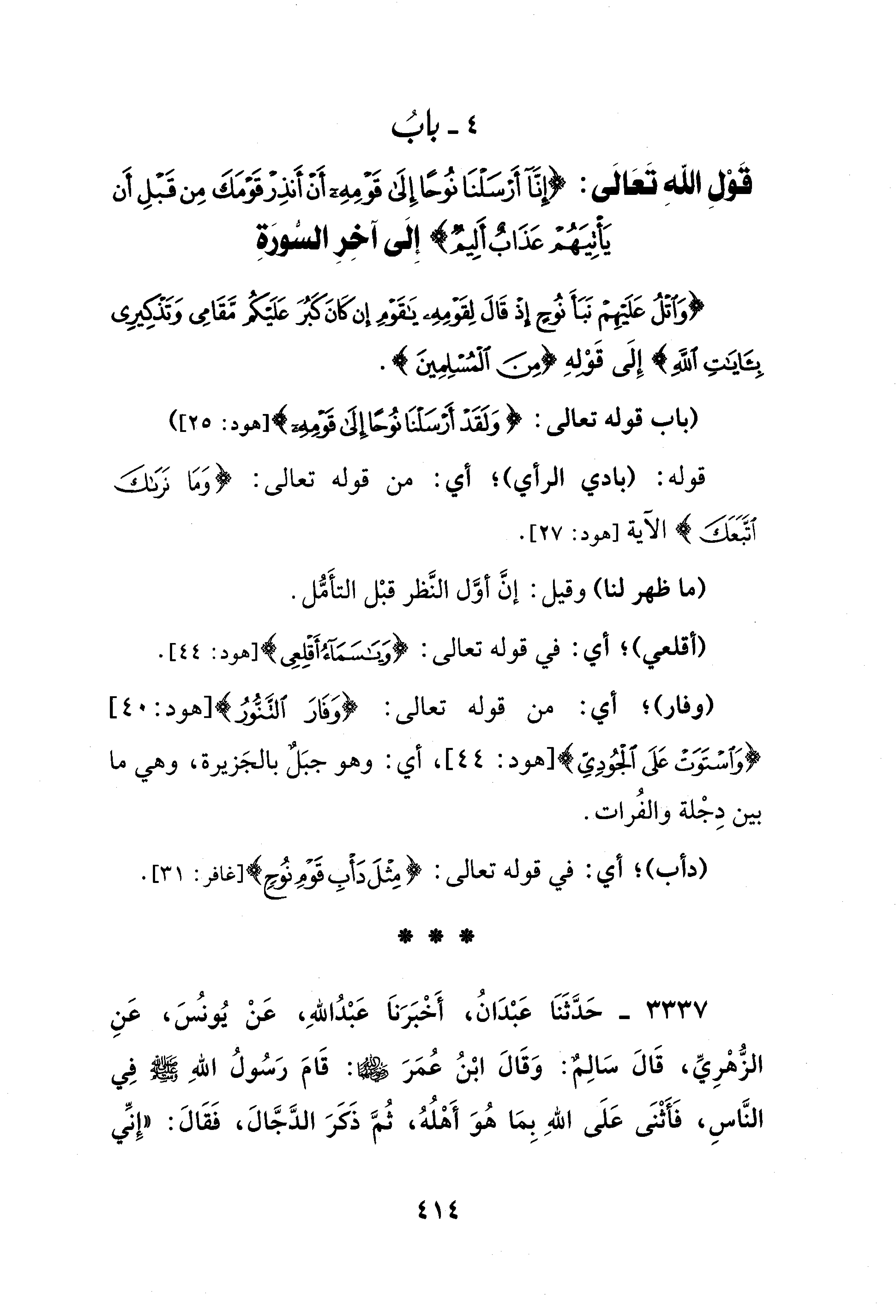4 - بابُ قول الله: {إِنَّا أَرْسَلْنَا نُوحًا إِلَى قَوْمِهِ أَنْ أَنْذِرْ قَوْمَكَ مِنْ قَبْلِ أَنْ يَأْتِيَهُمْ عَذَابٌ أَلِيمٌ} الى آخر السُّورة