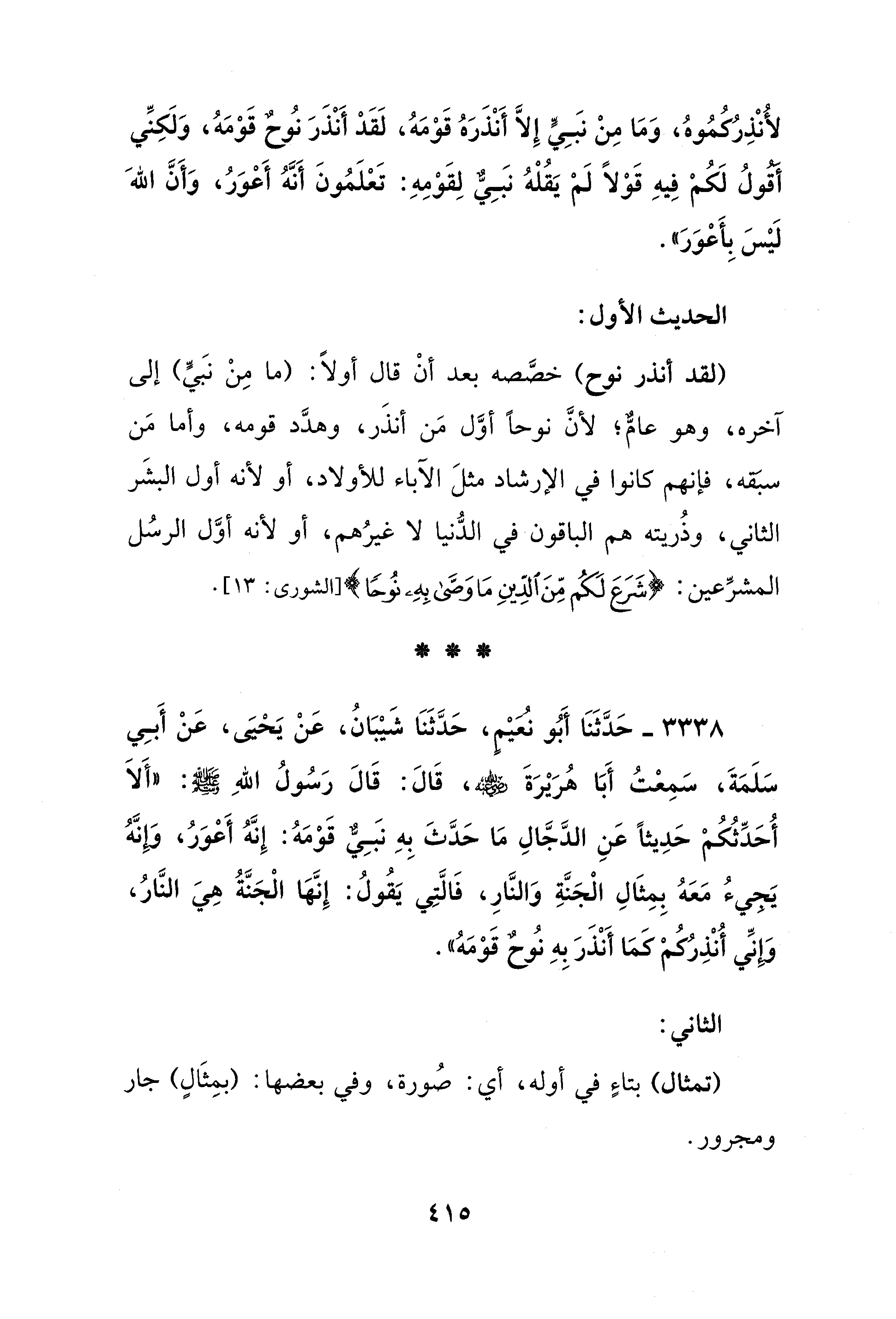 3338 - حَدَّثَنَا أَبُو نُعَيْمٍ، حَدَّثَنَا شَيْبَانُ، عَنْ يَحْيَىَ، عَنْ أَبِي سَلَمَةَ، سَمِعْتُ أَبَا هُرَيْرَةَ - رضي الله عنه -، قَالَ: قَالَ رَسُولُ اللهِ - صلى الله عليه وسلم -: "أَلاَ أُحَدِّثُكُم حَدِيثًا عَنِ الدَّجَّالِ مَا حَدَّثَ بِهِ نبَيٌّ قَوْمَهُ: إِنَّهُ أَعْوَرُ، وَإِنَّهُ يَجيءُ مَعَهُ بِمِثَالِ الْجَنَّةِ وَالنَّارِ، فَالَّتِي يَقُولُ: إِنَّها الْجَنَّةُ هِيَ النَّارُ، وَإِنِّي أُنْذِرُكُم كَمَا أَنْذَرَ بِهِ نُوحٌ قَوْمَهُ".