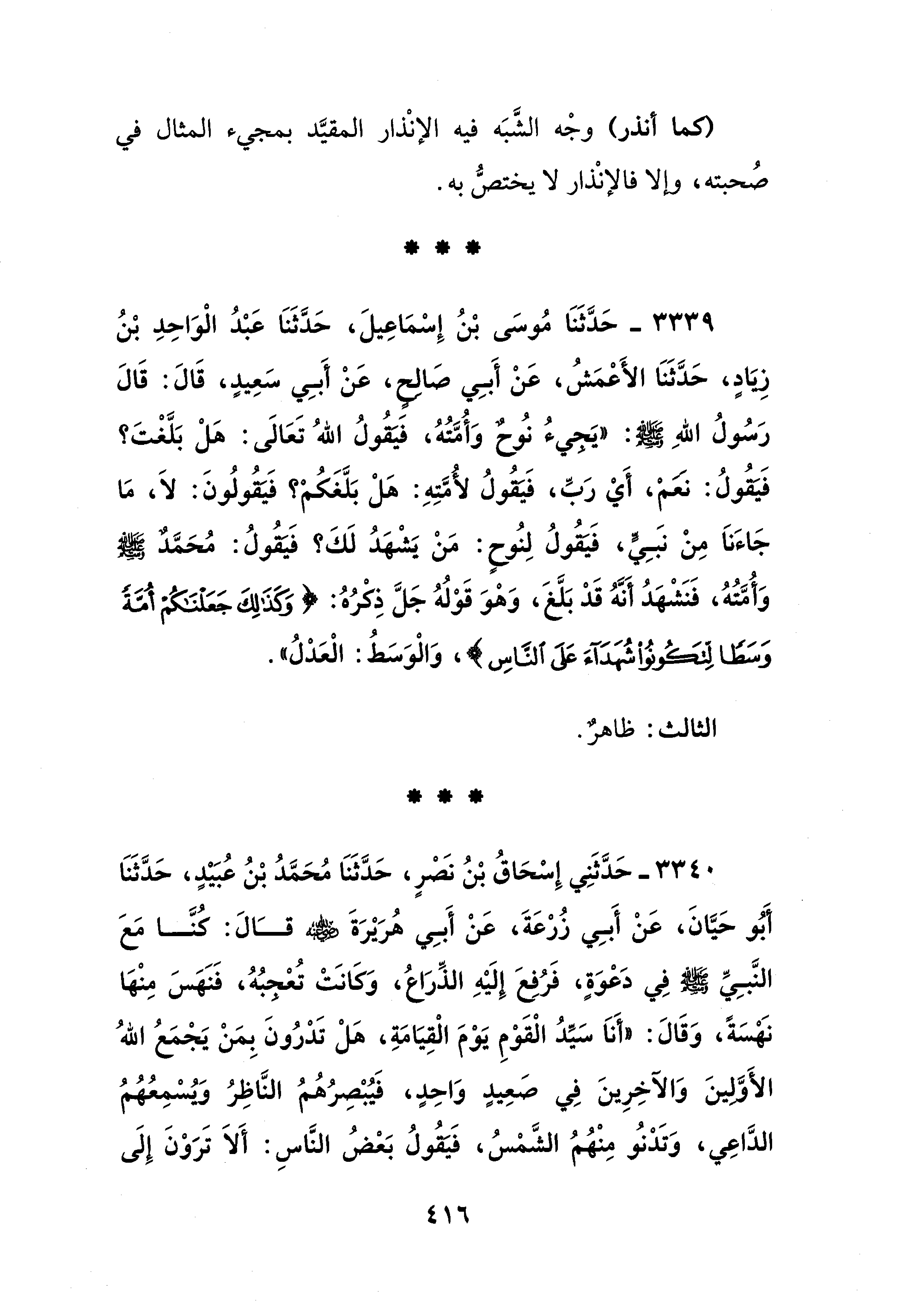 3339 - حَدَّثَنَا مُوسَى بْنُ إِسْمَاعِيلَ، حَدَّثَنَا عَبْدُ الْوَاحِدِ بْنُ زِيَادٍ، حَدَّثَنَا الأعْمَشُ، عَنْ أَبِي صَالح، عَنْ أَبِي سَعِيدٍ، قَالَ: قَالَ رَسُولُ اللهِ - صلى الله عليه وسلم -: "يَجيءُ نُوحٌ وَأُمَّتُهُ، فيقُولُ اللهُ تَعَالَى: هلْ بَلَّغْتَ؟ فيقُولُ: نعمْ، أَيْ رَبِّ، فَيَقُولُ لأُمَّتِهِ: هلْ بَلَّغَكُمْ؟ فَيقُولُونَ: لاَ، مَا جَاءَناَ مِنْ نبِيٍّ، فَيقُولُ لِنُوحٍ: مَنْ يَشهدُ لَكَ؟ فَيقُولُ: مُحَمَّدٌ - صلى الله عليه وسلم - وَأُمَّتهُ، فَنَشهدُ أَنَّهُ قد بَلَّغَ، وَهْوَ قَوْلُهُ جَلَّ ذكرهُ: {وَكَذَلِكَ جَعَلْنَاكُمْ أُمَّةً وَسَطًا لِتَكُونُوا شُهَدَاءَ عَلَى النَّاسِ}، وَالْوَسَطُ: الْعدلُ".