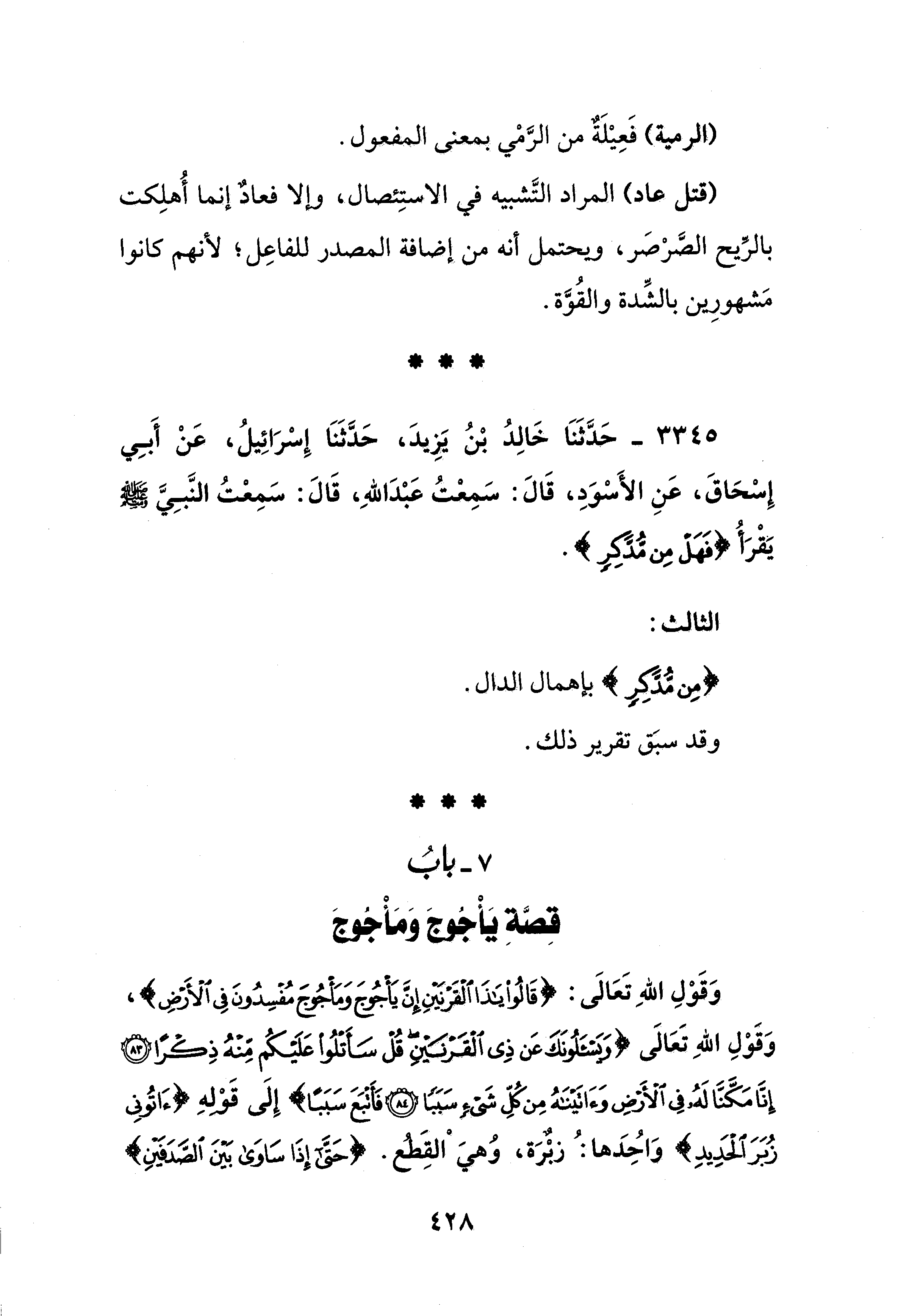 3345 - حَدَّثَنَا خَالِدُ بْنُ يَزِيدَ، حَدَّثَنَا إِسْرَائِيلُ، عَنْ أَبِي إِسْحَاقَ، عَنِ الأَسْوَدِ، قَالَ: سَمِعتُ عَبْدَ اللهِ، قَالَ: سَمِعْتُ النَّبِيَّ - صلى الله عليه وسلم - يقرَأُ {فَهَلْ مِنْ مُدَّكِرٍ}.
