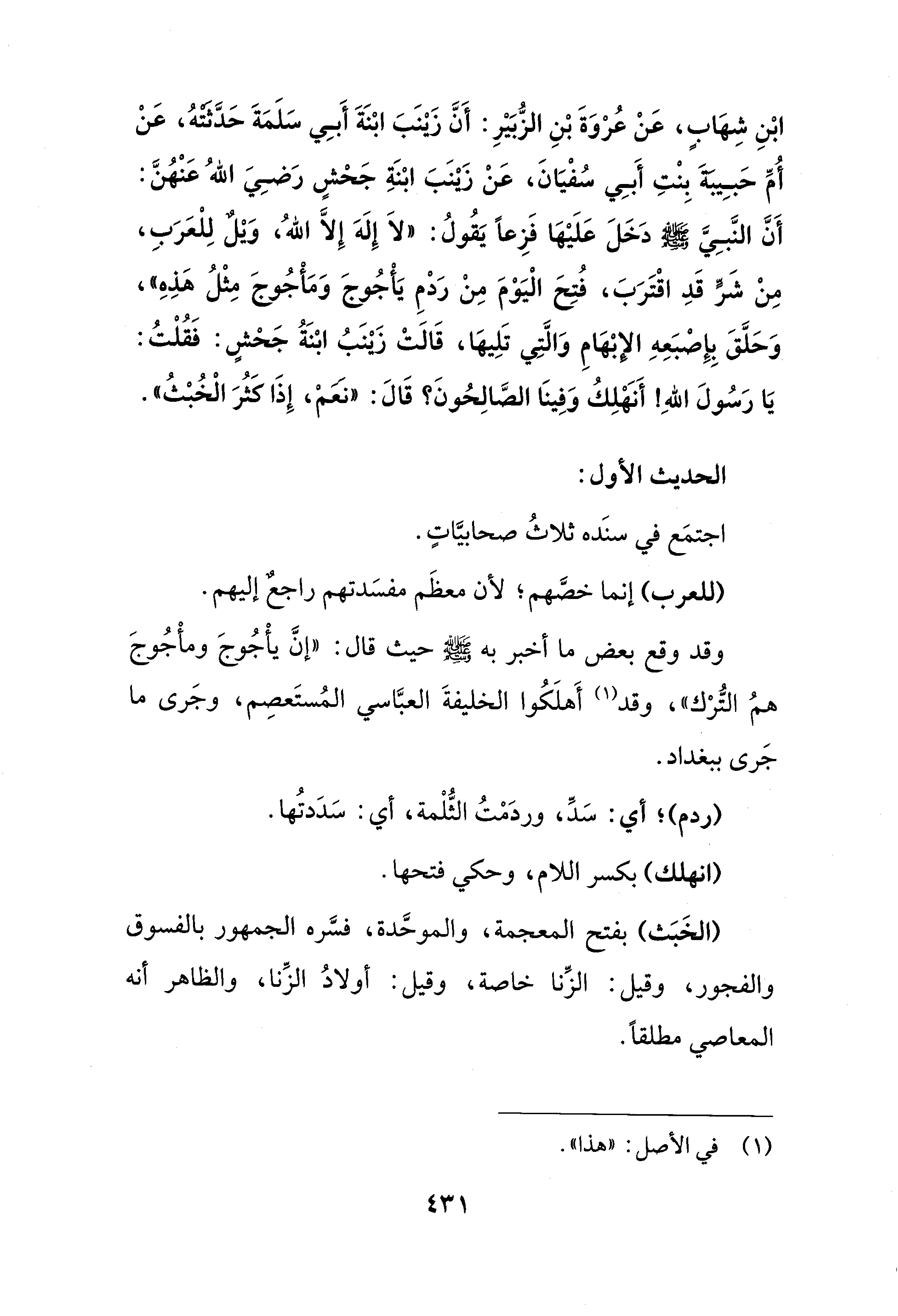 ابْنِ شِهابٍ، عَنْ عُرْوَةَ بْنِ الزُّبَيْرِ: أَنَّ زينَبَ ابْنَةَ أَبِي سَلَمَةَ حَدّثتهُ، عَنْ أُمِّ حَبِيبةَ بِنْتِ أَبِي سُفْيَانَ، عَنْ زينَبَ ابْنَةِ جَحْشٍ رَضِيَ اللهُ عَنْهُنَّ: أَنَّ النَّبِيَّ - صلى الله عليه وسلم - دَخَلَ عَلَيْها فَزِعًا يَقُولُ: "لاَ إِلَه إِلَّا اللهُ، وَيْلٌ لِلْعَرَبِ، مِنْ شَرٍّ قَدِ اقْتَرَبَ، فُتِحَ الْيَوْمَ مِنْ رَدْمِ يَأجُوجَ وَمَأجُوجَ مِثْلُ هذِهِ"، وَحَلَّقَ بِإِصبَعِهِ الإبْهامِ وَالَّتي تَلِيها، قَالَتْ زينَبُ ابْنَةُ جَحشٍ: فَقُلْتُ: يَا رَسُولَ اللهِ! أَنَهْلِكُ وَفِينَا الصَّالِحُونَ؟ قَالَ: "نعمْ، إِذَا كَثُرَ الْخُبْثُ".