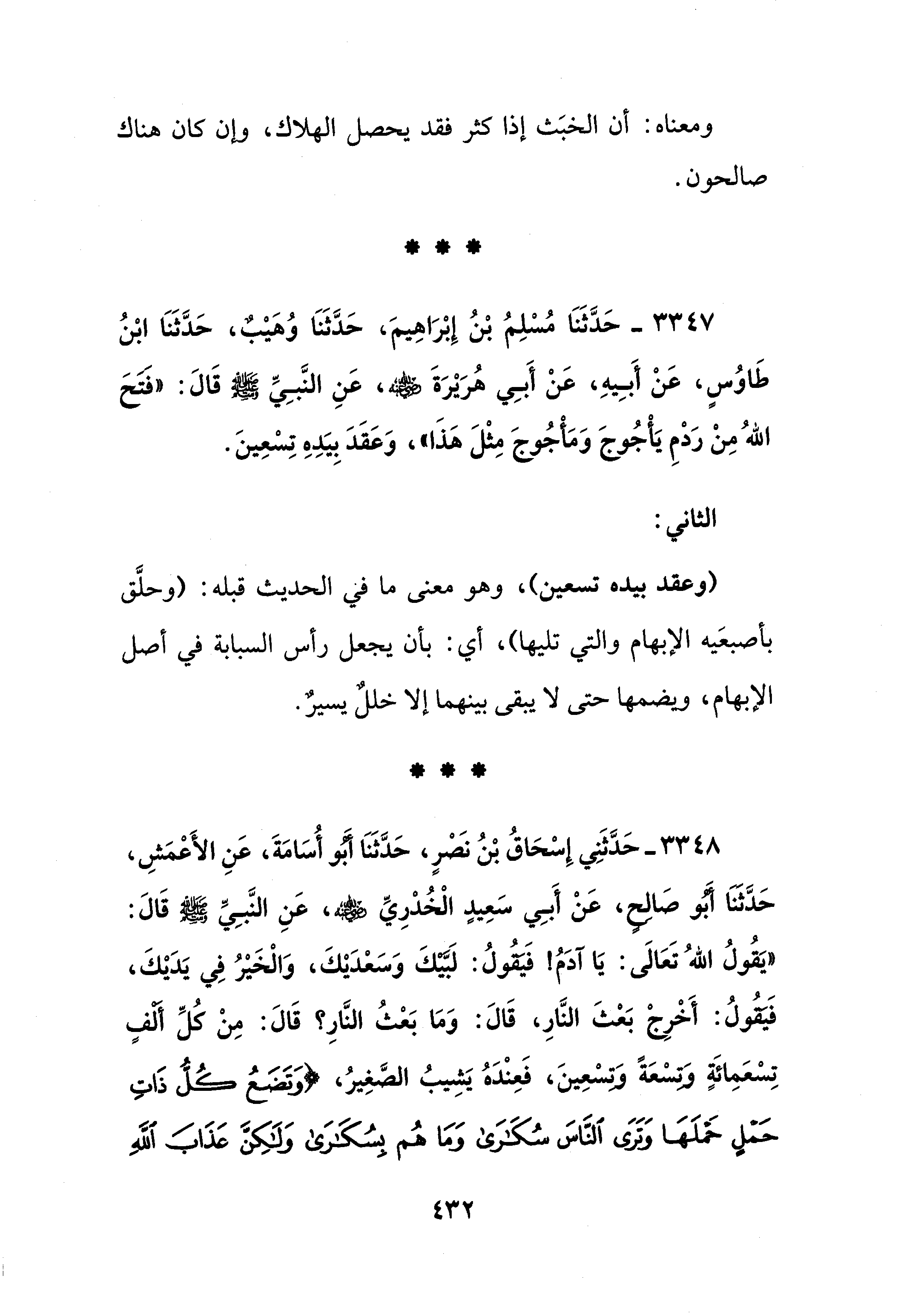 3347 - حَدَّثَنَا مُسْلِمُ بْنُ إِبْرَاهِيمَ، حَدَّثَنَا وُهيْبٌ، حَدَّثَنَا ابْنُ طَاوُسٍ، عَنْ أَبِيهِ، عَنْ أَبِي هُرَيْرَة - رضي الله عنه -، عَنِ النَّبِيِّ - صلى الله عليه وسلم - قَالَ: "فتحَ اللهُ مِنْ ردْمِ يَأْجُوجَ وَمَأجُوجَ مِثْلَ هذَا"، وَعَقَدَ بِيَدِهِ تِسْعِينَ.