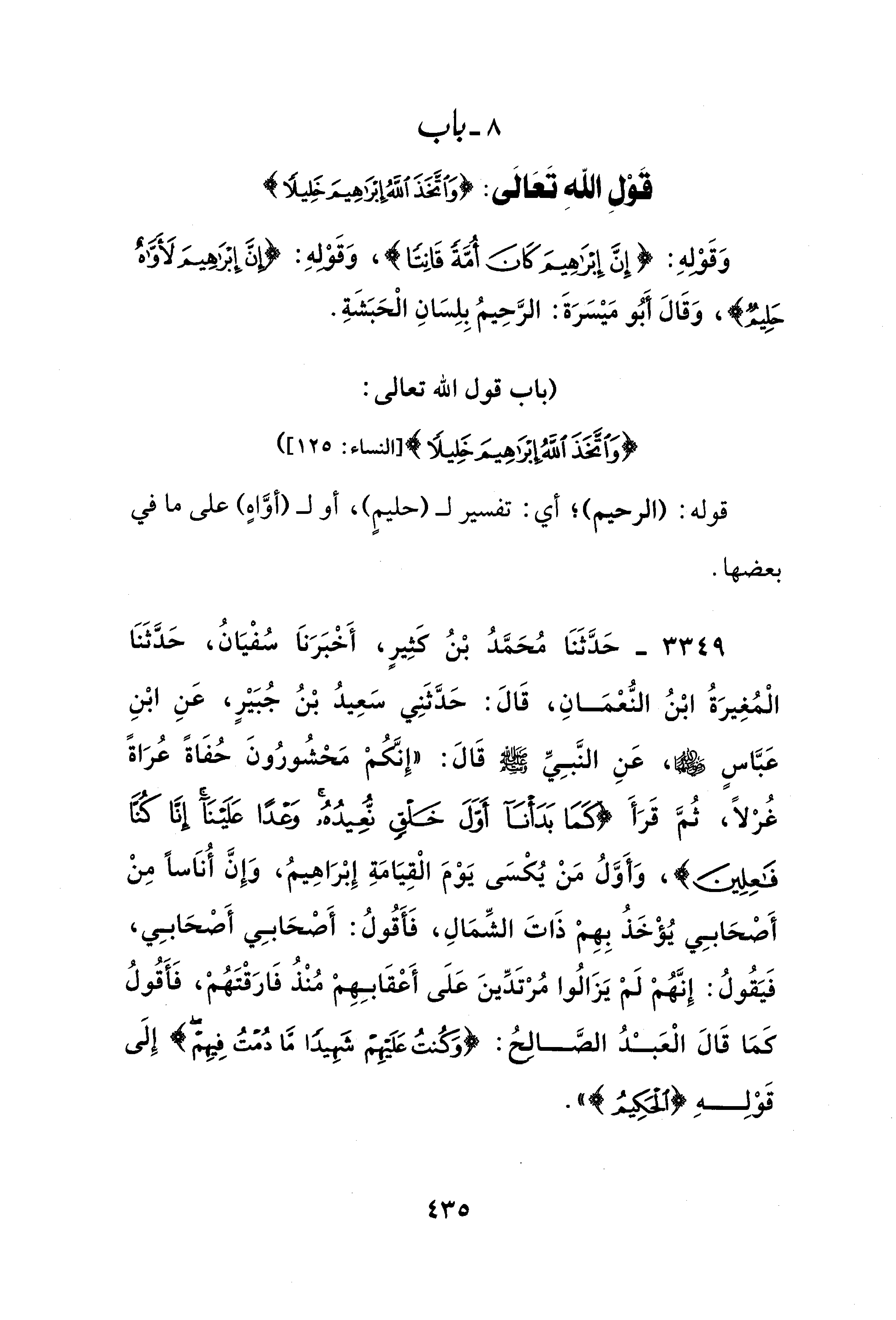 3349 - حَدَّثَنَا مُحَمَّدُ بْنُ كثِيرٍ، أَخْبَرَنَا سُفْيَانُ، حَدَّثَنَا الْمُغِيرَةُ بْنُ النُّعْمَانِ، قَالَ: حَدَّثَنِي سَعِيدُ بْنُ جُبَيْرٍ، عَنِ ابْنِ عَبَّاس - رضي الله عنهما -، عَنِ النَّبِيِّ - صلى الله عليه وسلم - قَالَ: "إِنَّكُم مَحشُورُونَ حُفَاةً عُرَاةً غُرْلًا، ثُمَّ قَرَأَ {كَمَا بَدَأْنَا أَوَّلَ خَلْقٍ نُعِيدُهُ وَعْدًا عَلَيْنَا إِنَّا كُنَّا فَاعِلِينَ}، وَأَوَّلُ مَنْ يُكْسَى يَوْمَ الْقِيَامَةِ إِبْرَاهِيمُ، وَإِنَّ أُناَسًا مِنْ أَصْحَابِي يُؤْخَذُ بِهِم ذَاتَ الشِّمَالِ، فَأَقُولُ: أَصحَابِي أصحَابِي، فَيَقُولُ: إِنَّهُم لَمْ يَزَالُوا مُرْتَدِّينَ عَلَى أَعْقَابِهم مُنْذُ فَارَقْتَهُم، فَأَقُولُ كَمَا قَالَ الْعَبْدُ الصَّالحُ: {وَكُنْتُ عَلَيْهِمْ شَهِيدًا مَا دُمْتُ فِيهِمْ} إِلَى قَوْلهِ {الحكيمُ} ".