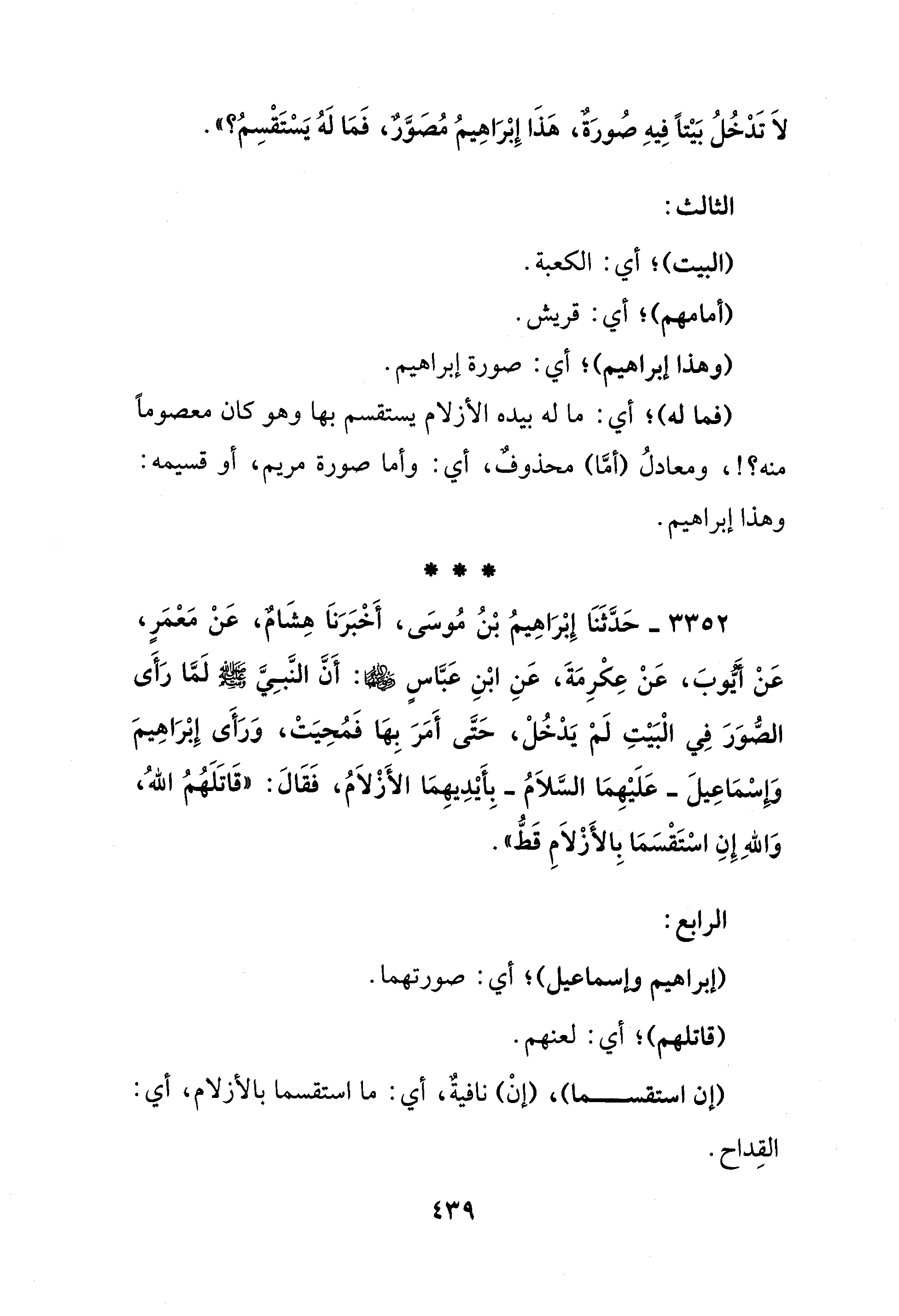 3352 - حَدَّثَنَا إِبْرَاهِيمُ بْنُ مُوسَى، أَخْبَرَنَا هِشَامٌ، عَنْ معْمَرٍ، عَنْ أيُّوبَ، عَنْ عِكْرِمَةَ، عَنِ ابْنِ عَبَّاسٍ - رضي الله عنهما -: أَنَّ النَّبِيَّ - صلى الله عليه وسلم - لَمَّا رَأَى الصُّوَرَ فِي الْبَيْتِ لَمْ يَدخُلْ، حَتَّى أَمَرَ بِها فَمُحِيَتْ، وَرَأَى إِبْرَاهِيمَ وإسْمَاعِيلَ -عَلَيْهِمَا السَّلاَمُ- بِأيْدِيهِمَا الأَزْلاَمُ، فَقَالَ: "قَاتَلَهُمُ اللهُ، وَاللهِ إِنِ اسْتَقْسَمَا بِالأَزْلاَمِ قَطُّ".