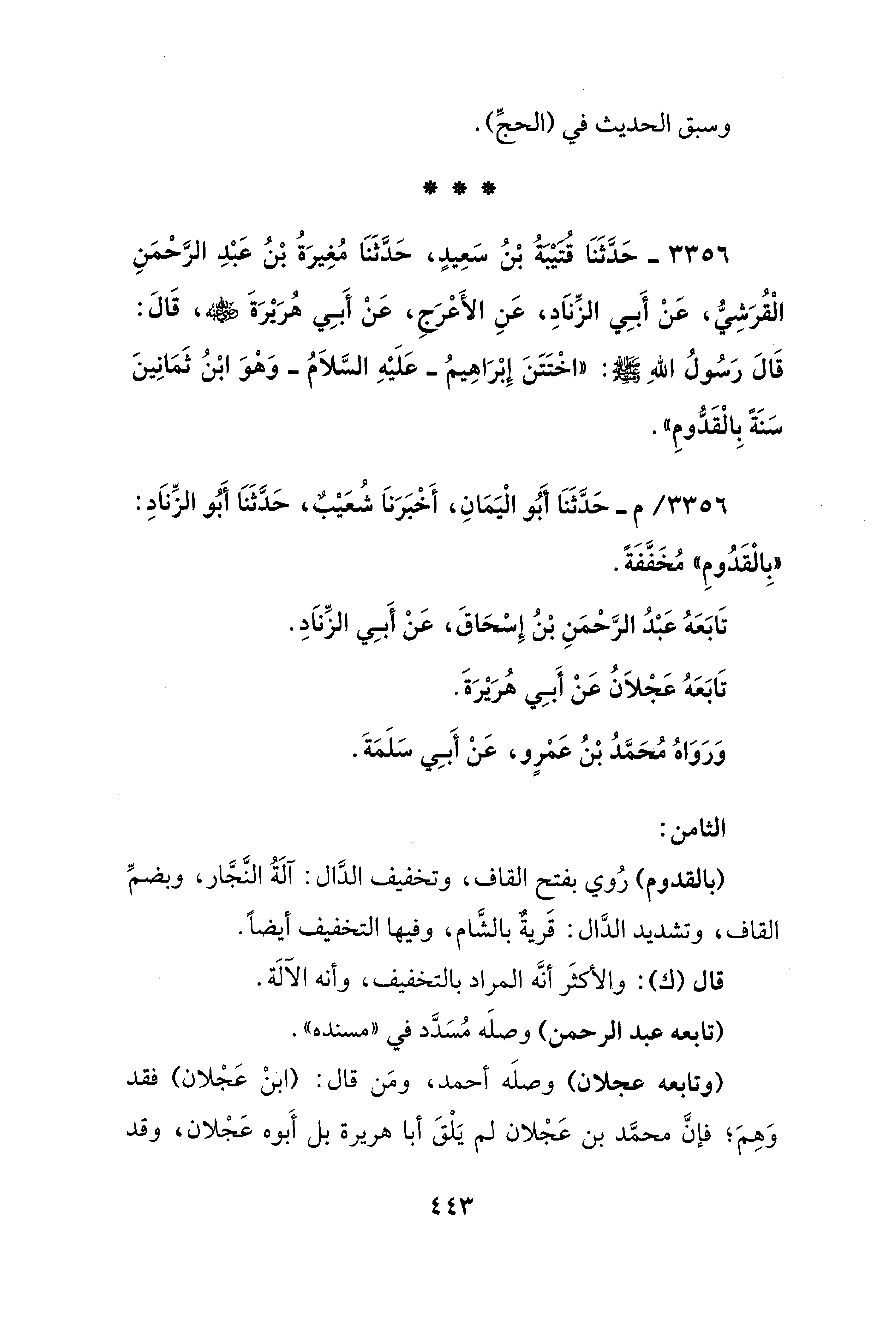 3356 - حَدَّثَنَا قُتَيْبَةُ بْنُ سَعِيدٍ، حَدَّثَنَا مُغِيرَةُ بْنُ عَبْدِ الرّحْمَنِ الْقُرَشِيُّ، عَنْ أَبِي الزِّنَادِ، عَنِ الأعْرَجِ، عَنْ أَبِي هُرَيْرَة - رضي الله عنه -، قَالَ: قَالَ رَسُولُ اللهِ - صلى الله عليه وسلم -: "اخْتَتَنَ إِبْرَاهِيمُ -عَلَيْهِ السَّلاَمُ- وَهْوَ ابْنُ ثَمَانِينَ سَنَةً بِالْقَدُّومِ".