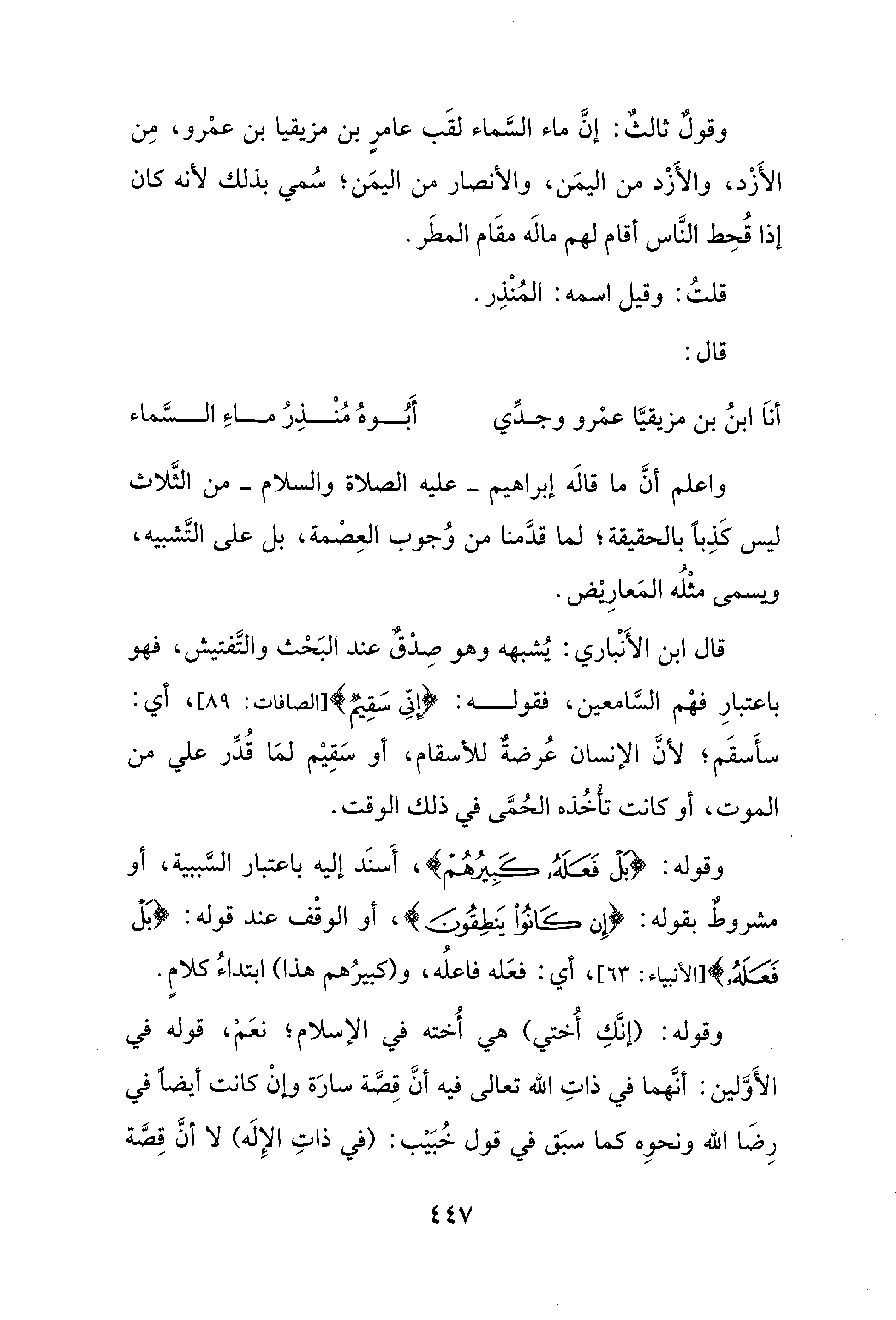 واعلم أنَّ ما قالَه إبراهيم -عليه الصلاة والسلام- من الثَّلاث ليس كَذِبًا بالحقيقة؛ لما قدَّمنا من وُجوب العِصْمة، بل على التَّشبيه، ويسمى مثْلُه المَعاريض.