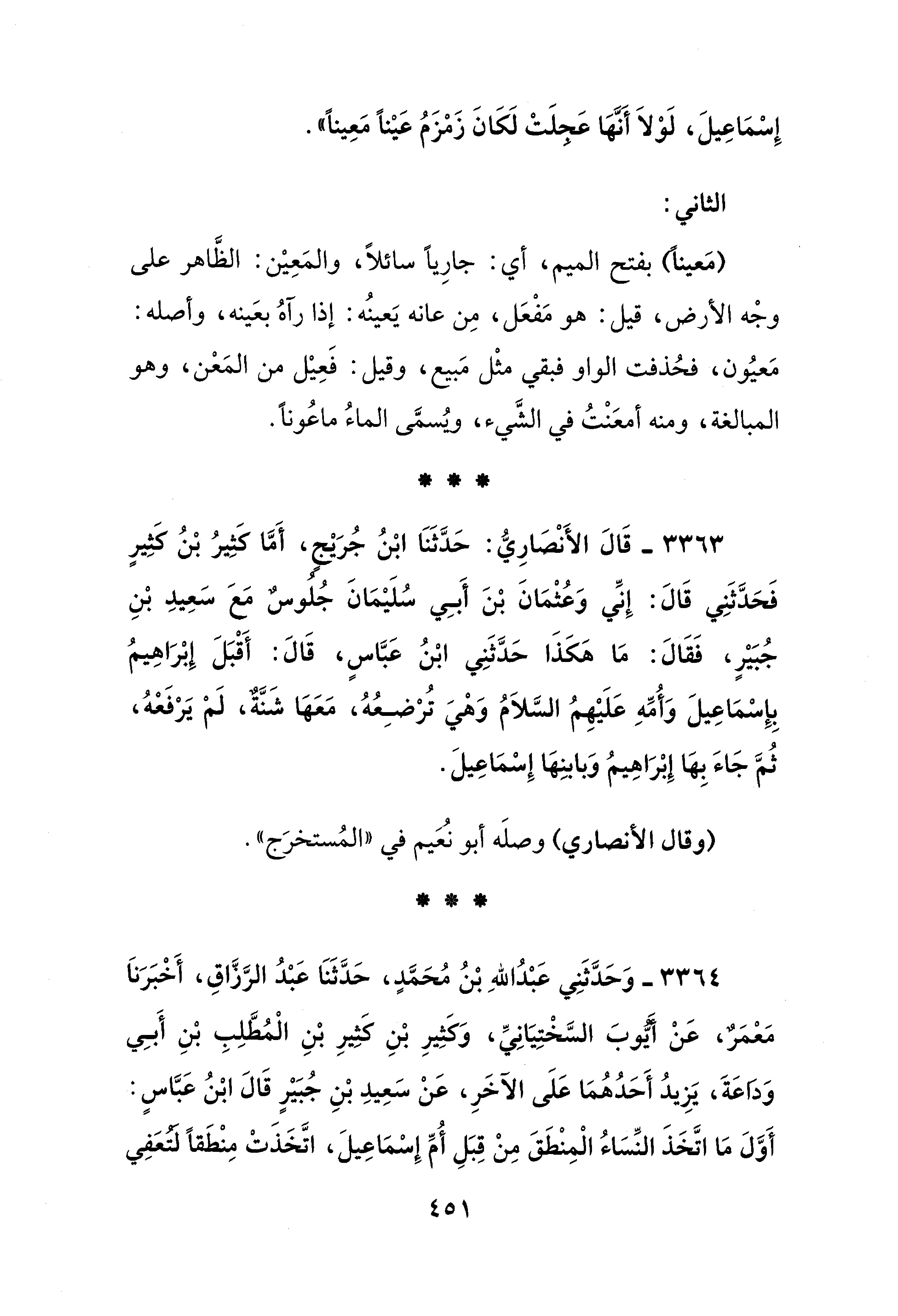 3363 - قَالَ الأَنْصَاريُّ: حَدَّثَنَا ابْنُ جُرَيْج، أَمَّا كَثِيرُ بْنُ كَثِير فَحَدَّثَنِي قَالَ: إِنِّي وَعُثْمَانَ بْنَ أَبِي سُليْمَانَ جُلوسٌ مَعَ سَعِيدِ بْنِ جُبَيْرٍ، فَقَالَ: مَا هكَذَا حَدَّثَنِي ابْنُ عَبَّاسٍ، قَالَ: أَقْبَلَ إِبْرَاهِيمُ بِإِسْمَاعِيلَ وَأُمِّهِ عَلَيْهِمُ السَّلاَمُ وَهْيَ تُرْضِعُهُ، مَعَها شَنَّةٌ، لَمْ يَرْفَعْهُ، ثُمَّ جَاءَ بِها إِبْرَاهِيمُ وَبابنِها إِسْمَاعِيلَ.