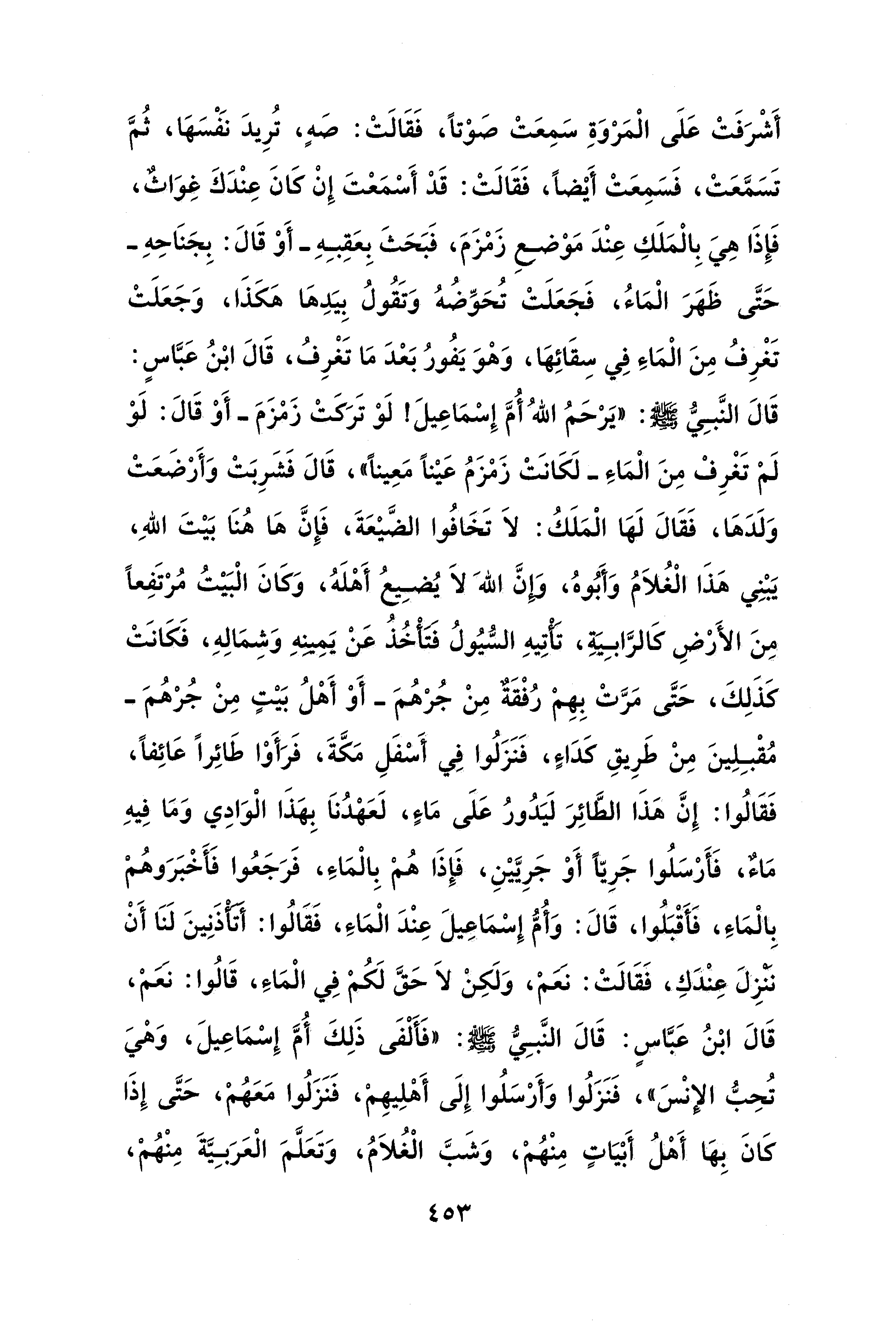 أَشْرَفَتْ عَلَى الْمَروَةِ سَمِعَتْ صَوْتًا، فَقَالَتْ: صَهٍ، تُرِيدَ نَفْسَها، ثُمَّ تَسَمَّعَتْ، فَسَمِعَتْ أَيْضًا، فَقَالَتْ: قَدْ أَسْمَعتَ إِنْ كَانَ عِنْدَكَ غِوَاثٌ، فَإِذَا هِيَ بِالْمَلَكِ عِنْدَ مَوْضعِ زَمزَمَ، فَبَحَثَ بِعَقِبِهِ -أَوْ قَالَ: بِجَنَاحِهِ- حَتَّى ظَهرَ الْمَاءُ، فَجَعَلَتْ تُحَوِّضُهُ وَتَقُولُ بِيَدها هكَذَا، وَجَعَلَتْ تَغْرِفُ مِنَ الْمَاءِ فِي سِقَائها، وَهْوَ يَفُورُ بَعدَ مَا تَغْرِفُ، قَالَ ابْنُ عَبَّاسٍ: قَالَ النبِيُّ - صلى الله عليه وسلم -: "يَرْحَمُ اللهُ أُمَّ إِسمَاعِيلَ! لَوْ تَرَكَتْ زَمزَمَ -أَوْ قَالَ: لَوْ لَمْ تَغْرِفْ مِنَ الْمَاءِ- لَكَانَتْ زَمزَمُ عَيْنًا مَعِينًا"، قَالَ فَشَرِبَتْ وَأَرْضَعَتْ وَلَدَها، فَقَالَ لَها الْمَلَكُ: لاَ تَخَافُوا الضَّيْعَةَ، فَإِنَّ ها هُنَا بَيْتَ اللهِ، يَبْنِي هذَا الْغُلاَمُ وَأَبُوهُ، وَإِنَّ الله لاَ يُضِيعُ أَهْلَهُ، وَكانَ الْبَيْتُ مُرْتَفِعًا مِنَ الأَرْضِ كَالرَّابِيةِ، تأتِيهِ السُّيُولُ فتأْخُذُ عَنْ يَمِينهِ وَشِمَالِهِ، فَكَانَتْ كَذَلِكَ، حَتَّى مَرَّتْ بِهِم رُفْقَةٌ مِنْ جُرْهُمَ -أَوْ أَهْلُ بَيْتٍ مِنْ جُرْهُمَ- مُقْبِلِينَ مِنْ طَرِيقِ كَدَاءٍ، فَنَزَلُوا فِي أَسْفَلِ مَكَّةَ، فَرَأَوْا طَائِرًا عَائِفًا، فَقَالُوا: إِنَّ هذَا الطائِرَ لَيَدُورُ عَلَى مَاءِ، لَعَهْدُناَ بِهذَا الْوَادِي وَمَا فِيهِ مَاءٌ، فَأرسَلُوا جَرِيًّا أَوْ جَرِيَّيْنِ، فَإِذَا هُمْ بِالْمَاءِ، فَرَجَعُوا فَأَخْبَرَوهُمْ بِالْمَاءِ، فَأَقْبَلُوا، قَالَ: وَأُمُّ إِسْمَاعِيلَ عِنْدَ الْمَاءِ، فَقَالُوا: أتأذَنِينَ لَنَا أَنْ ننزِلَ عِنْدَكِ، فَقَالَتْ: نعم، وَلَكِنْ لاَ حَقَّ لَكُم فِي الْمَاءَ، قَالُوا: نعم، قَالَ ابْنُ عَبَّاسٍ: قَالَ النَّبِيُّ - صلى الله عليه وسلم -: "فَأَلْفَى ذَلِكَ أُمَّ إِسْمَاعِيلَ، وَهْيَ تُحِبُّ الإنْسَ"، فَنَزَلُوا وَأَرسَلُوا إِلَى أَهْلِيهم، فَنَزَلُوا مَعَهُم، حَتَّى إِذَا كَانَ بِها أَهْلُ أَبْيَاتٍ مِنْهُم، وَشَبَّ الْغُلاَمُ، وَتَعَلَّمَ الْعَرَبِيَّةَ مِنْهم،
