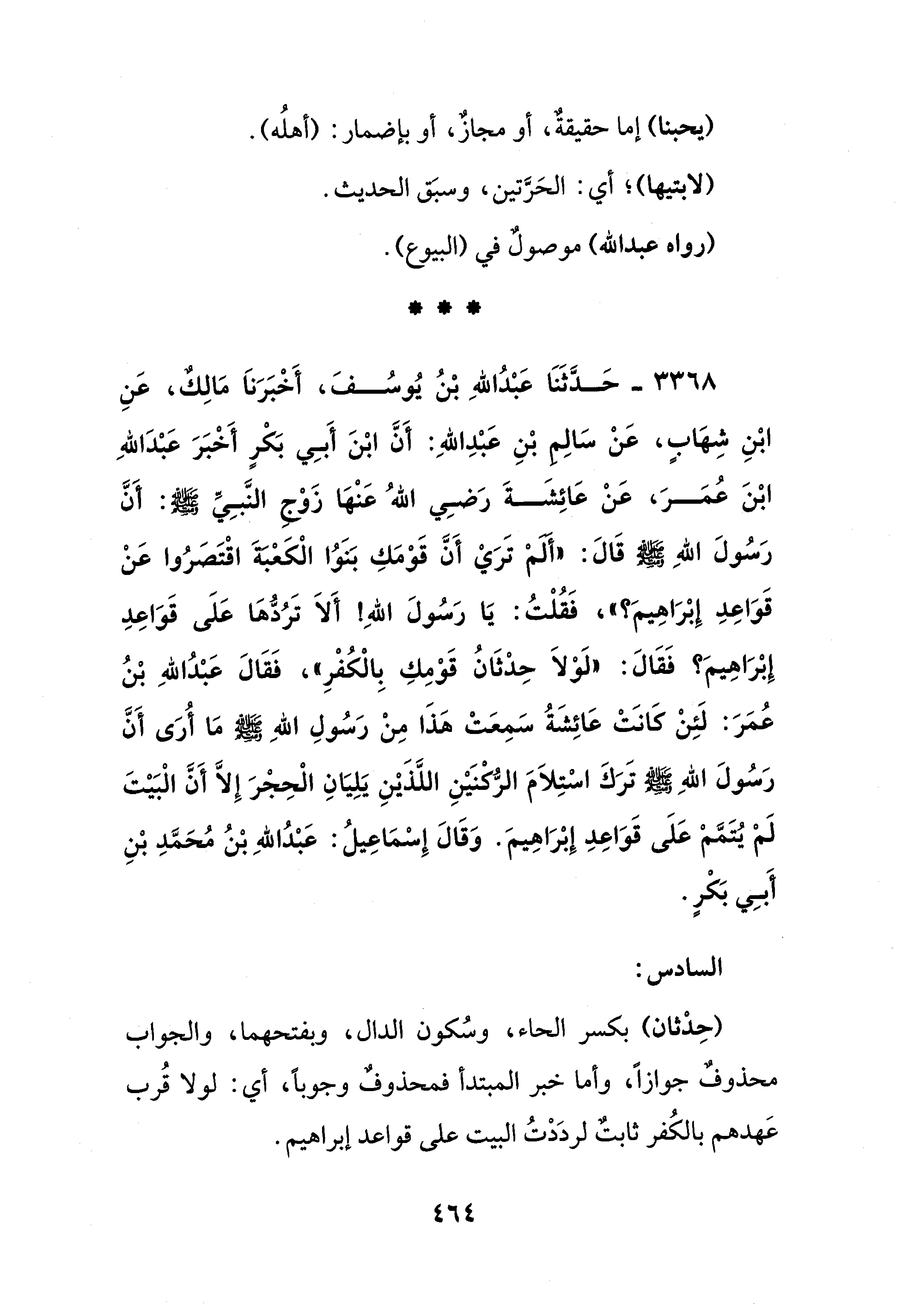 3368 - حَدَّثَنَا عَبْدُ اللهِ بْنُ يُوسُفَ، أَخْبَرَنَا مَالِكٌ، عَنِ ابْنِ شِهابٍ، عَنْ سَالِم بْنِ عَبْدِ اللهِ: أَنَّ ابْنَ أَبِي بَكْرٍ أَخْبَرَ عَبْدَ اللهِ بْنَ عُمَرَ، عَنْ عَائِشَةَ رَضِي اللهُ عَنْها زَوْجِ النَّبِيِّ - صلى الله عليه وسلم -: أَنَّ رَسُولَ اللهِ - صلى الله عليه وسلم - قَالَ: "ألم تَرَيْ أَنَّ قَوْمَكِ بَنَوُا الْكعْبَة اقْتَصَرُوا عَنْ قَوَاعِدِ إِبْرَاهِيمَ؟ "، فَقُلْتُ: يَا رَسُولَ الله! أَلاَ تَرُدُّها عَلَى قَوَاعِدِ إِبْرَاهِيمَ؟ فَقَالَ: "لَوْلاَ حِدثَانُ قَوْمِكِ بِالْكُفْر"، فَقَالَ عَبْدُ اللهِ بْنُ عُمَرَ: لَئِنْ كَانَتْ عَائِشَةُ سَمِعَتْ هذَا مِنْ رَسُولِ اللهِ - صلى الله عليه وسلم - مَا أُرَى أَنَّ رَسُولَ اللهِ - صلى الله عليه وسلم - تَرَكَ اسْتِلاَمَ الرُّكنَيْنِ اللَّذَيْنِ يَلِيَانِ الْحِجْرَ إلا أَنَّ الْبَيْتَ لَمْ يُتمَّم عَلَى قَوَاعِدِ إِبْرَاهِيمَ. وَقَالَ إِسْمَاعِيلُ: عَبْدُ اللهِ بْنُ مُحَمَّدِ بْنِ أَبِي بَكْر.