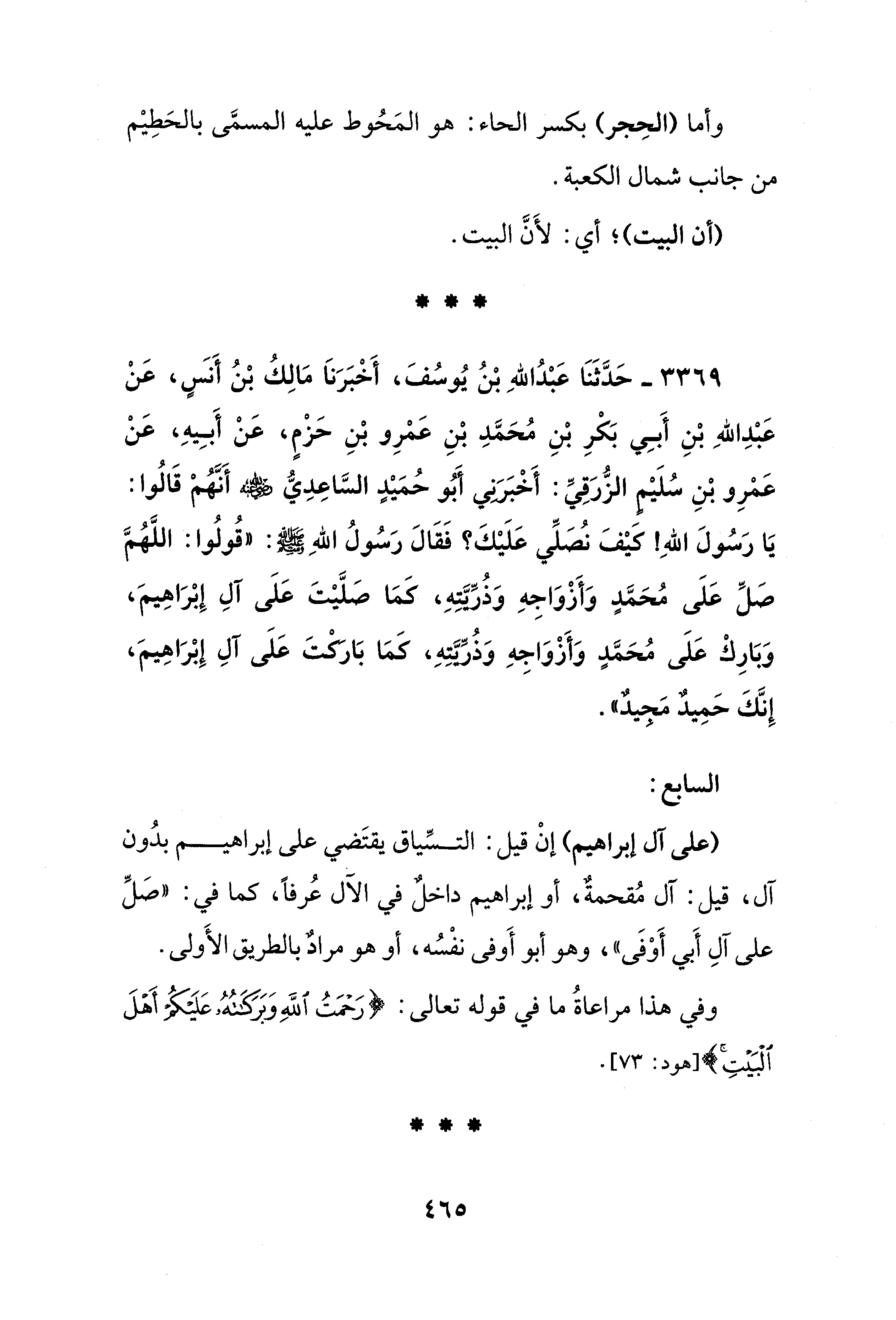 3369 - حَدَّثَنَا عَبْدُ اللهِ بْنُ يُوسُفَ، أَخْبَرَنَا مَالِكُ بْنُ أَنسٍ، عَنْ عَبْدِ اللهِ بْنِ أَبِي بَكْرِ بْنِ مُحَمَّدِ بْنِ عمرِو بْنِ حَزْمٍ، عَنْ أَبِيهِ، عَنْ عَمرِو بْنِ سُلَيْم الزُّرَقِيِّ: أَخْبَرَني أَبُو حُمَيْدٍ السَّاعِدِيُّ - رضي الله عنه - أَنَّهُم قَالُوا: يَا رَسُولَ اللهِ! كَيْفَ نُصَلِّي عَلَيْكَ؟ فَقَالَ رَسُولُ اللهِ - صلى الله عليه وسلم -: "قُولُوا: اللَّهُمَّ صَلِّ عَلَى مُحَمَّدٍ وَأَزْوَاجِهِ وَذُرِّيَّتِهِ، كمَا صَلَّيْتَ عَلَى آلِ إِبْرَاهِيمَ، وَبَارِكْ عَلَى مُحَمَّدٍ وَأَزْوَاجِهِ وَذُرِّيَّتِهِ، كمَا بَاركتَ عَلَى آلِ إِبْرَاهِيمَ، إِنَّكَ حَمِيدٌ مَجِيدٌ".