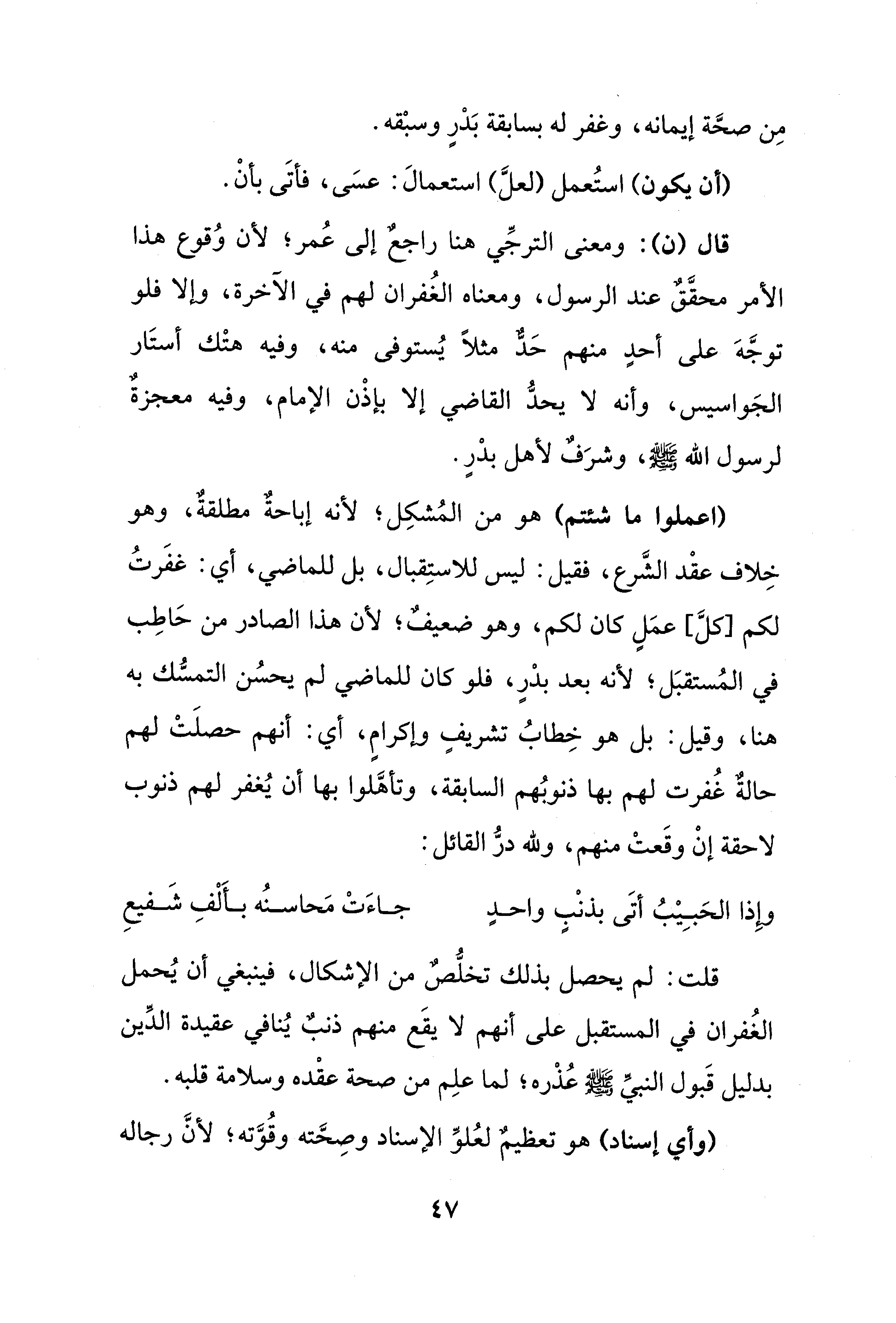 (اعملوا ما شئتم) هو من المُشكِل؛ لأنه إباحةٌ مطلقةٌ، وهو خِلاف عقْد الشَّرع، فقيل: ليس للاستِقبال، بل للماضي، أي: غفَرتُ لكم [كلَّ] عمَلٍ كان لكم، وهو ضعيفٌ؛ لأن هذا الصادر من حَاطِب في المُستقبَل؛ لأنه بعد بدْرٍ، فلو كان للماضي لم يحسُن التمسُّك به هنا، وقيل: بل هو خِطابُ تشريفٍ وإكرامٍ، أي: أنهم حصلَتْ لهم حالةٌ غُفرت لهم بها ذنوبُهم السابقة، وتأهَّلوا بها أن يُغفر لهم ذنوب لاحقة إنْ وقَعتْ منهم، ولله درُّ القائل: