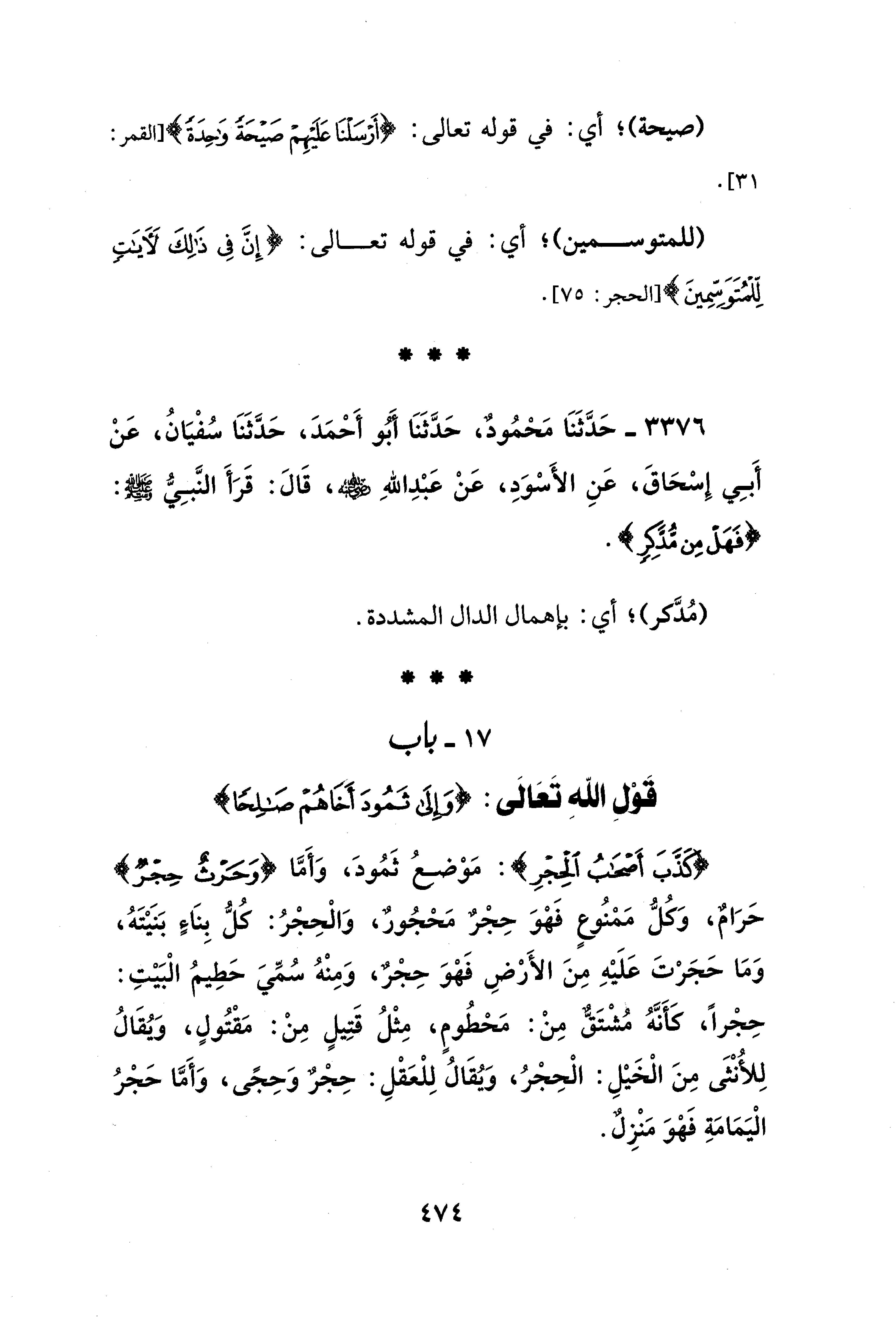 3376 - حَدَّثَنَا محْمُودٌ، حَدَّثَنَا أَبُو أحْمَدَ، حَدَّثَنَا سُفْيَانُ، عَنْ أَبِي إِسْحَاقَ، عَنِ الأَسْوَدِ، عَنْ عَبْدِ اللهِ - رضي الله عنه -، قَالَ: قَرَأَ النَّبِيُّ - صلى الله عليه وسلم -: {فهل مِن مُدَّكِرٍ}.