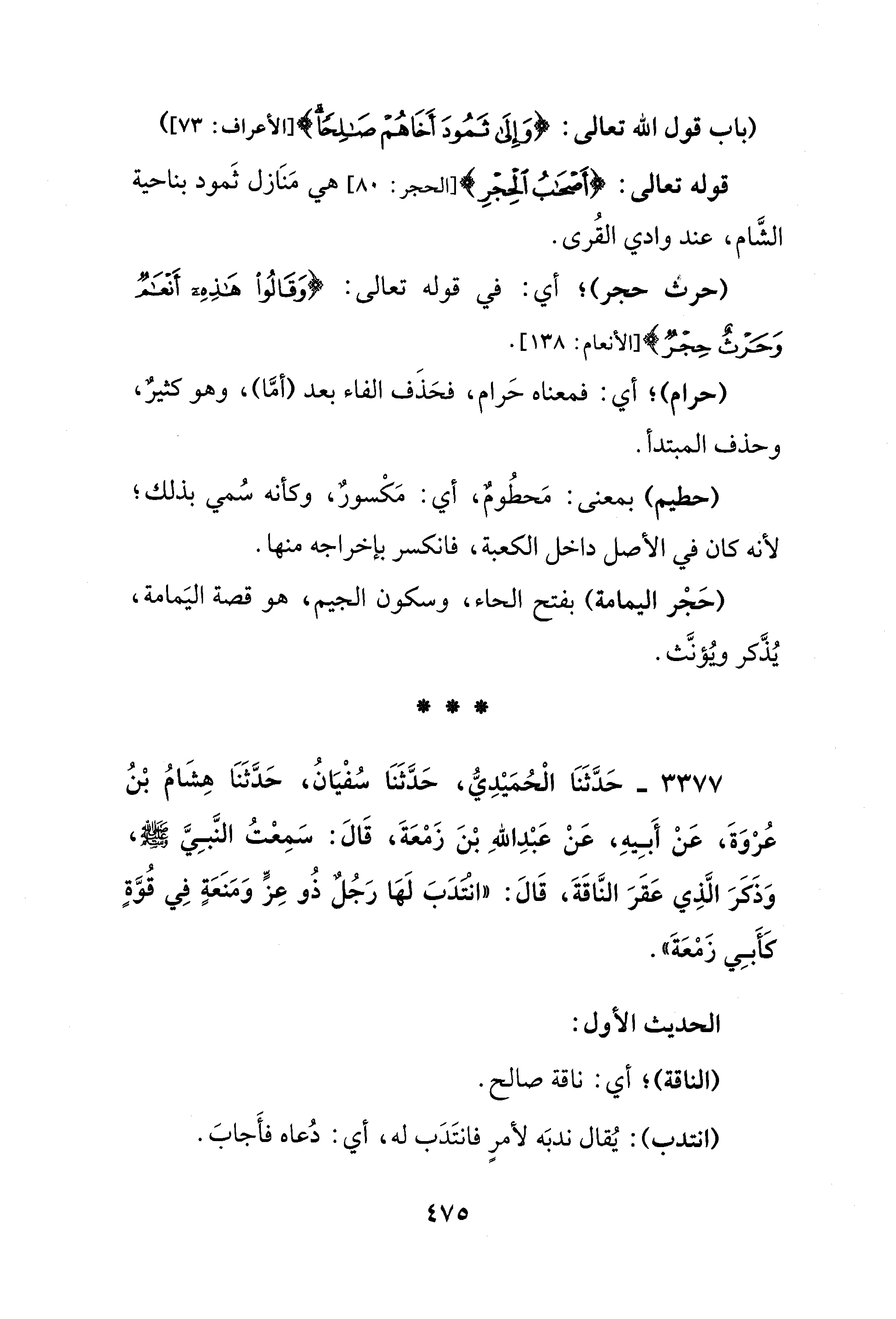3377 - حَدَّثَنَا الْحُمَيْدِيُّ، حَدَّثَنَا سُفْيَانُ، حَدَّثَنَا هِشَامُ بْنُ عُرْوَةَ، عَنْ أَبِيهِ، عَنْ عَبْدِ اللهِ بْنَ زَمْعَةَ، قَالَ: سَمِعْتُ النَّبِيَّ - صلى الله عليه وسلم -، وَذَكَرَ الَّذِي عَقَرَ النَّاقَةَ، قَالَ: "انتدَبَ لَها رَجلٌ ذُو عِزِّ وَمَنَعَةٍ فِي قُوَّةٍ كَأَبِي زمعَةَ".