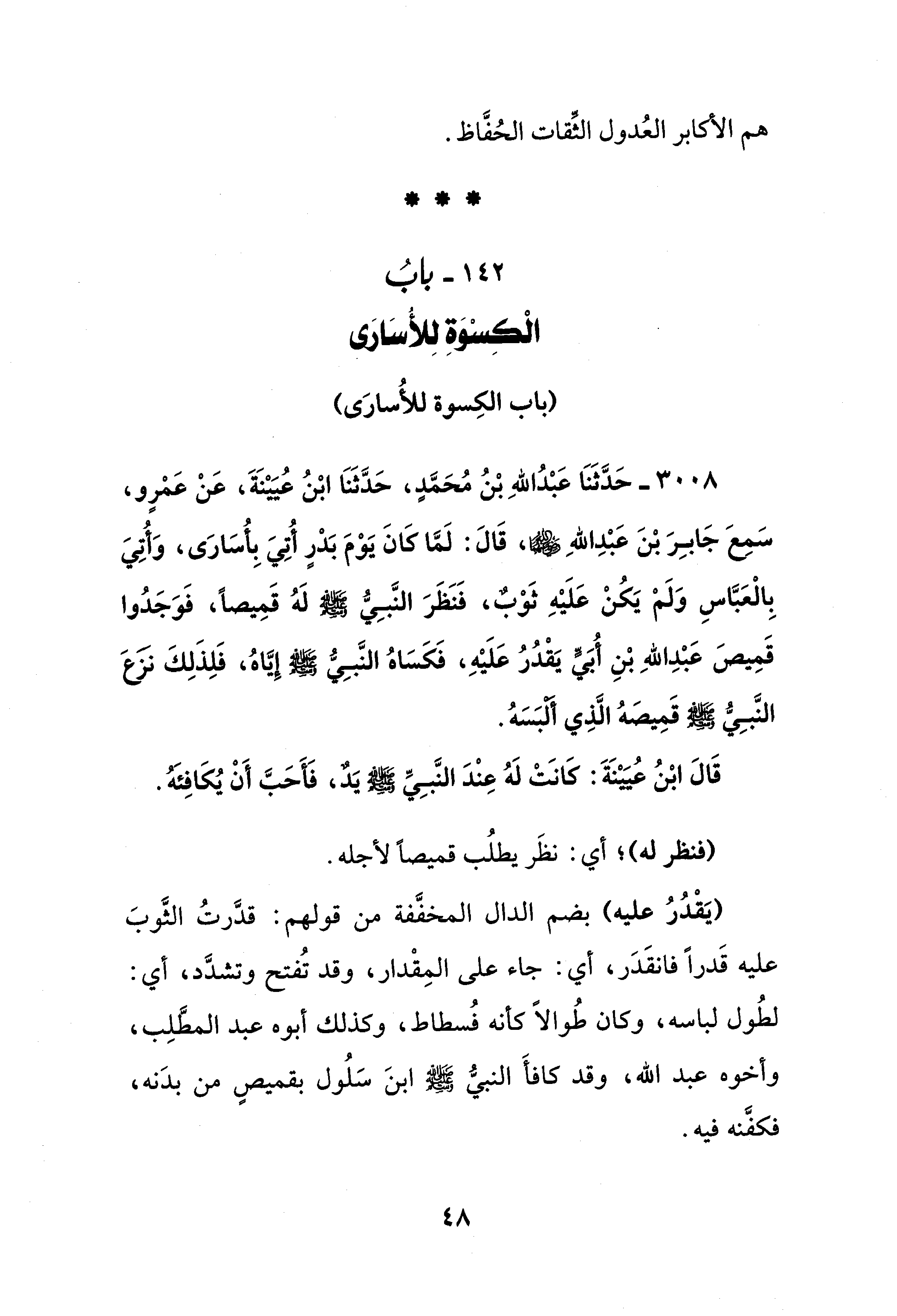3008 - حَدَّثَنَا عَبْدُ اللهِ بْنُ مُحَمَّدٍ، حَدَّثَنَا ابْنُ عُيَيْنَةَ، عَنْ عَمْرٍو، سَمعَ جَابِرَ بْنَ عَبْدِ اللهِ - رضي الله عنهما -، قَالَ: لَمَّا كَانَ يَوْمَ بَدْرٍ أُتِيَ بِأُسَارَى، وَأُتِيَ بِالْعَبَّاسِ وَلَمْ يَكُنْ عَلَيْهِ ثَوْبٌ، فَنَظَرَ النَّبِيُّ - صلى الله عليه وسلم - لَهُ قَمِيصًا، فَوَجَدُوا قَمِيصَ عَبْدِ اللهِ بْنِ أُبَيٍّ يَقْدُرُ عَلَيْهِ، فَكَسَاهُ النَّبِيُّ - صلى الله عليه وسلم - إِيَّاهُ، فَلِذَلِكَ نزَعَ النَّبِيُّ - صلى الله عليه وسلم - قَمِيصَهُ الَّذِي ألبَسَهُ.