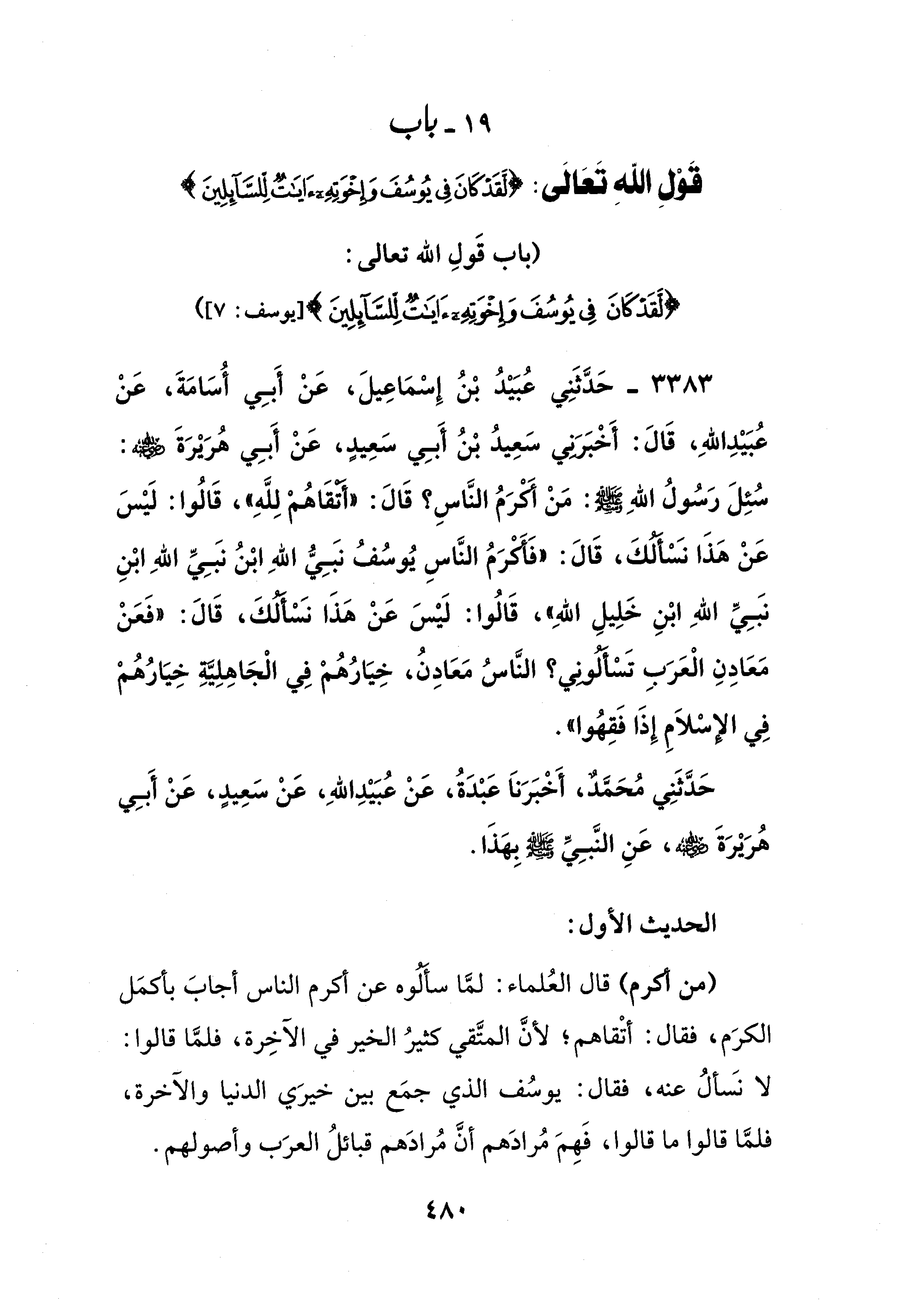 3383 - حَدَّثَنِي عُبَيْدُ بْنُ إِسْمَاعِيلَ، عَنْ أَبِي أُسَامَةَ، عَنْ عُبَيْدِ اللهِ، قَالَ: أَخْبَرَني سَعِيدُ بْنُ أَبِي سَعِيدٍ، عَنْ أَبِي هُرَيْرَة - رضي الله عنه -: سُئِلَ رَسُولُ اللهِ - صلى الله عليه وسلم -: مَنْ أكرَمُ النَّاسِ؟ قَالَ: "أتقَاهُمْ لِلَّهِ"، قَالُوا: لَيْسَ عَنْ هذَا نسألُكَ، قَالَ: "فأَكرَمُ النَّاسِ يُوسُفُ نبِيُّ اللهِ ابْنُ نبَيِّ اللهِ ابْنِ نبِيِّ اللهِ ابْنِ خَلِيلِ اللهِ"، قَالُوا: لَيْسَ عَنْ هذَا نسألكَ، قَالَ: "فَعَنْ مَعَادِنِ الْعَرَبِ تَسْألوني؟ النَّاسُ مَعَادِنُ، خِيَارُهمْ فِي الْجَاهِلِيَّةِ خِيَارُهُمْ فِي الإسْلاَمِ إذَا فَقِهُوا".