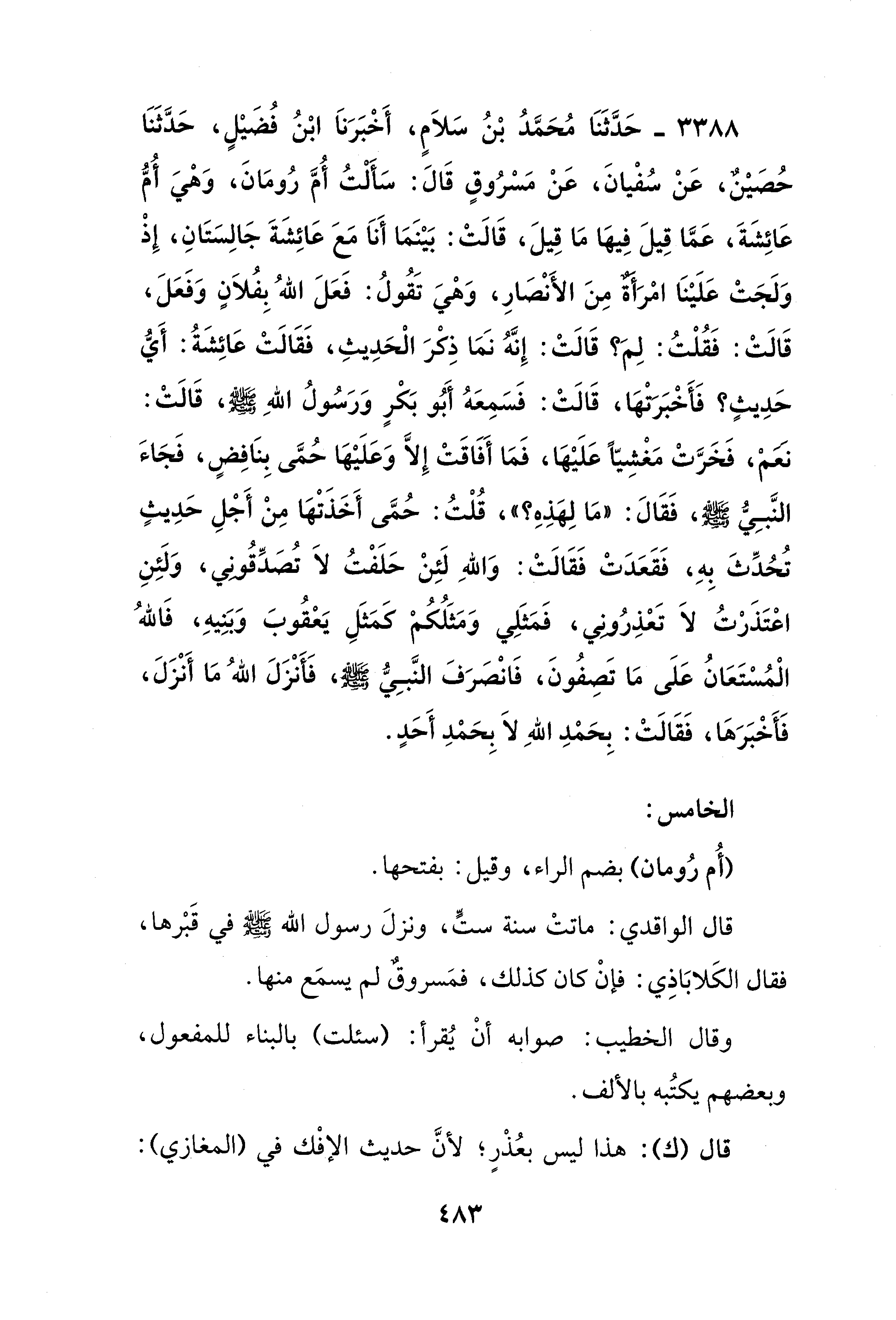 3388 - حَدَّثَنَا مُحَمَّدُ بْنُ سَلاَم، أَخْبَرَنَا ابْنُ فُضَيْلٍ، حَدَّثَنَا حُصَيْنٌ، عَنْ سُفْيانَ، عَنْ مَسْرُوقٍ قَالَ: سَأَلْتُ أُمَّ رُومَانَ، وَهْيَ أُمُّ عَائِشَةَ، عَمَّا قِيلَ فِيها مَا قِيلَ، قَالَتْ: بَيْنَمَا أَنَا مَعَ عَائِشَةَ جَالِسَتَانِ، إِذْ وَلَجَتْ عَلَيْنَا امرَأةٌ مِنَ الأَنْصَارِ، وَهْيَ تَقُولُ: فَعَلَ اللهُ بِفُلاَنٍ وَفَعَلَ، قَالَتْ: فَقُلْتُ: لِمَ؟ قَالَتْ: إِنَّهُ نَمَا ذِكْرَ الْحَدِيثِ، فَقَالَتْ عَائِشَةُ: أَيُّ حَدِيثٍ؟ فَأَخْبَرتها، قَالَتْ: فَسَمِعَهُ أَبُو بَكْرٍ وَرَسُولُ اللهِ - صلى الله عليه وسلم -، قَالَتْ: نعم، فَخَرَّتْ مَغْشِيًّا عَلَيْها، فَمَا أفاقَتْ إلا وَعَلَيْها حُمَّى بِنَافِضٍ، فَجَاءَ النَّبِيُّ - صلى الله عليه وسلم -، فَقَالَ: "مَا لِهذِهِ؟ "، قُلْتُ: حُمَّى أَخَذَتْها مِنْ أَجْلِ حَدِيثٍ تُحُدِّثَ بِهِ، فَقَعَدَتْ فَقَالَتْ: وَاللهِ لَئِنْ حَلَفْتُ لاَ تُصَدِّقُوني، وَلَئِنِ اعتَذَرْتُ لاَ تَعذِرُوني، فَمَثَلِي وَمَثَلُكُم كَمَثَلِ يَعقُوبَ وَبَنِيهِ، فَاللهُ الْمُسْتَعَانُ عَلَى مَا تَصِفُونَ، فَانْصَرَفَ النَّبِيُّ - صلى الله عليه وسلم -، فَأَنْزَلَ اللهُ مَا أَنْزَلَ، فَأَخْبَرَها، فَقَالَتْ: بِحَمدِ اللهِ لاَ بِحَمدِ أَحَدٍ.