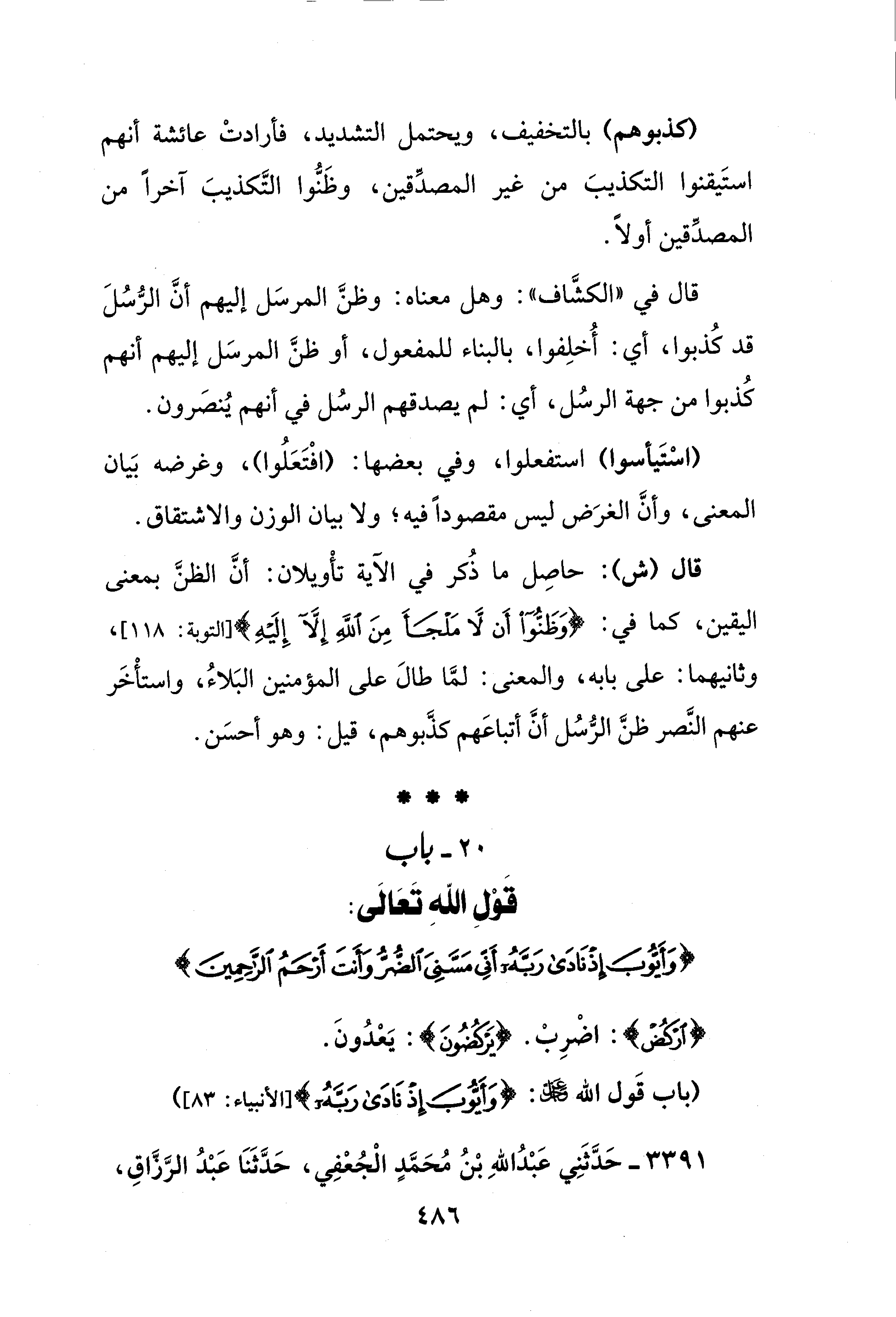 (كذبوهم) بالتخفيف، ويحتمل التشديد، فأرادتْ عائشة أنهم استَيقنوا التكذيبَ من غير المصدِّقين، وظَنُّوا التَّكذيبَ آخرًا من المصدِّقين أولًا.