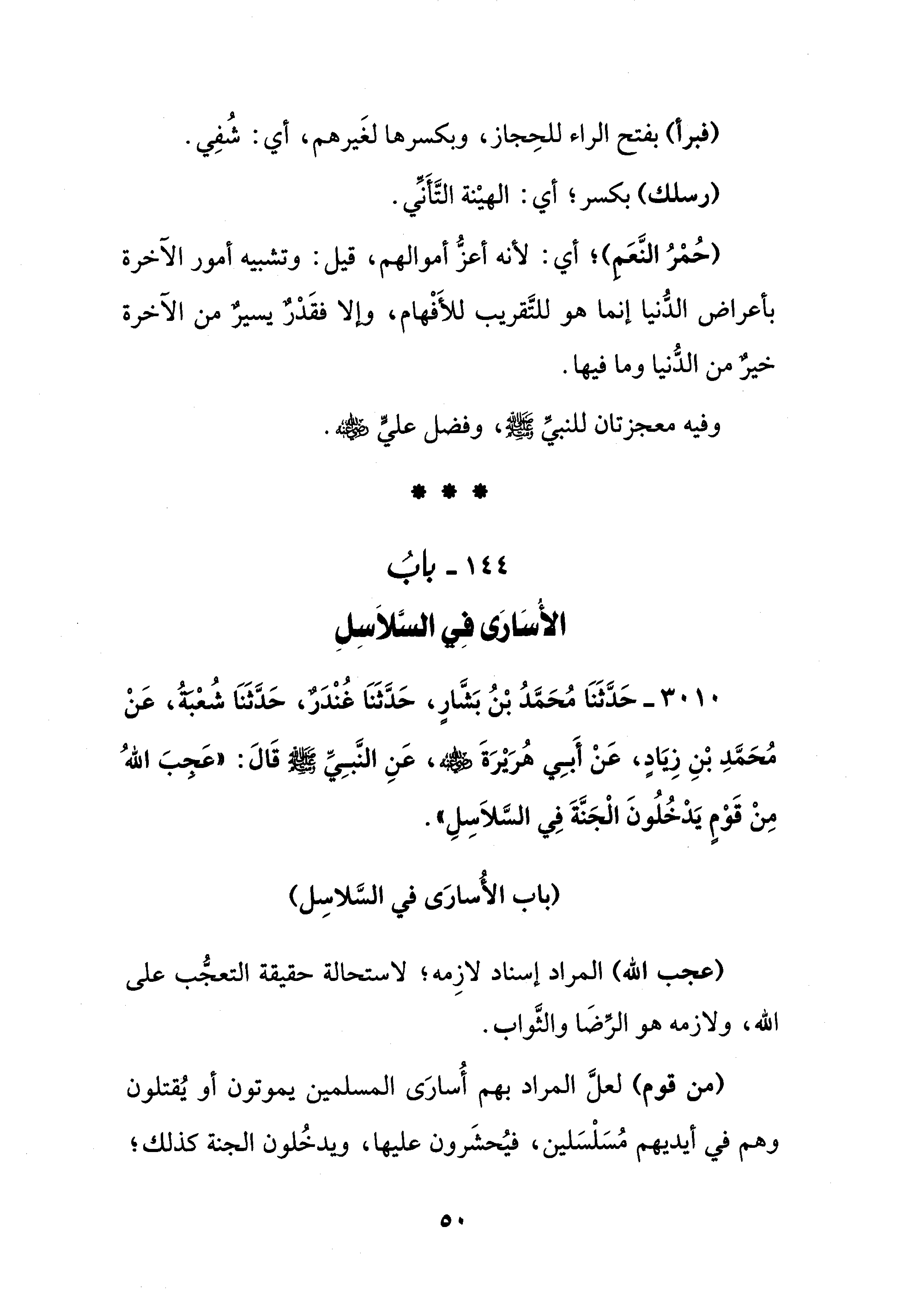 3010 - حَدَّثَنَا مُحَمَّدُ بْنُ بَشَّارٍ، حَدَّثَنَا غُنْدَرٌ، حَدَّثَنَا شُعْبَةُ، عَنْ مُحَمَّدِ بْنِ زِيَادٍ، عَنْ أَبِي هُرَيرَةَ - رضي الله عنه -، عَنِ النَّبِيِّ - صلى الله عليه وسلم - قَالَ: "عَجِبَ اللهُ مِنْ قَوْمٍ يَدْخُلُونَ الْجَنَّةَ فِي السَّلاَسِلِ".