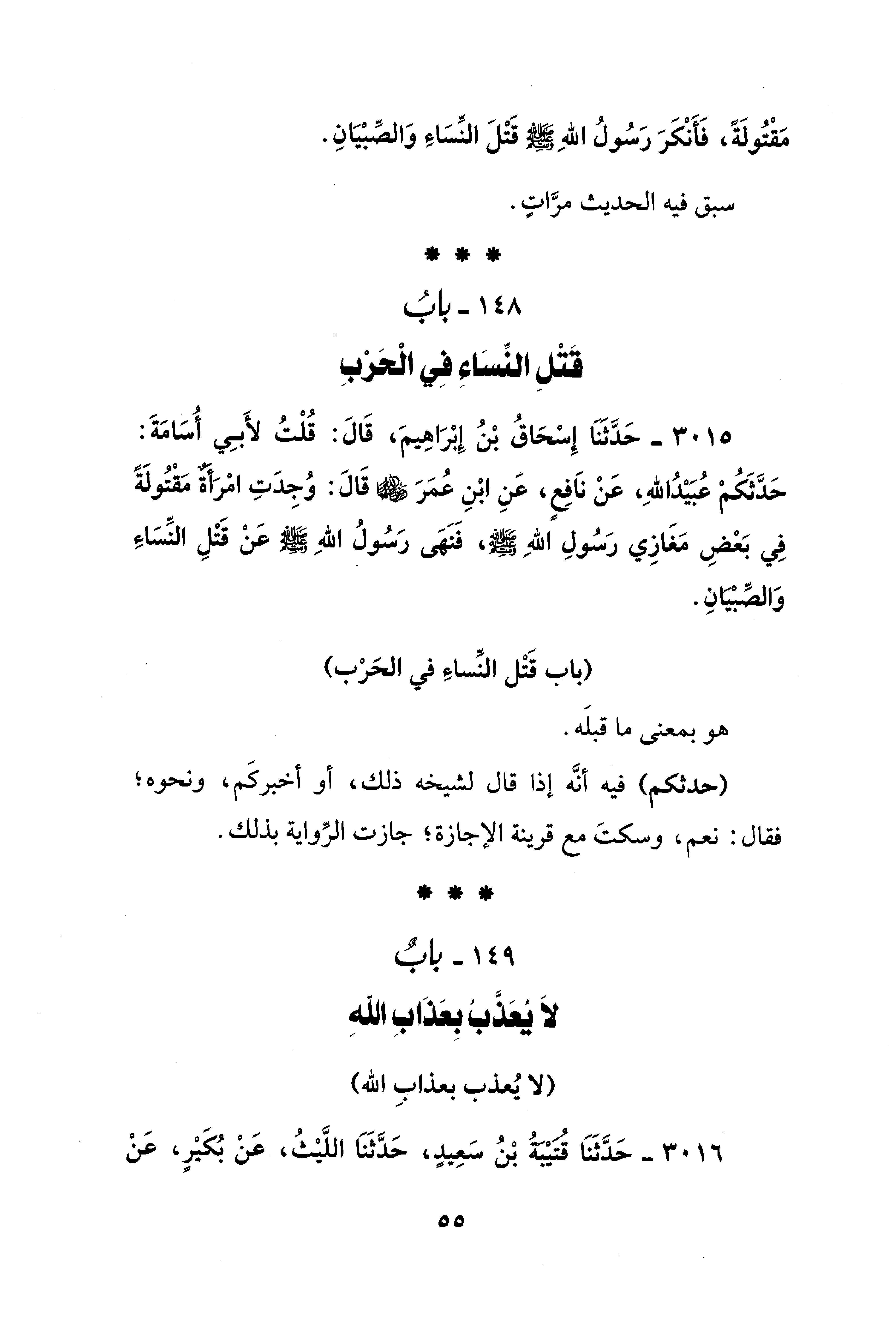 3015 - حَدَّثَنَا إِسْحَاقُ بْنُ إِبْرَاهِيمَ، قَالَ: قُلْتُ لأَبِي أُسَامَةَ: حَدَّثَكُمْ عُبَيْدُ اللهِ، عَنْ نَافِعٍ، عَنِ ابْنِ عُمَرَ - رضي الله عنهما - قَالَ: وُجِدَتِ امْرَأَةٌ مَقْتُولَةً فِي بَعْضِ مَغَازِي رَسُولِ اللهِ - صلى الله عليه وسلم -، فَنَهَى رَسُولُ اللهِ - صلى الله عليه وسلم - عَنْ قَتْلِ النِّسَاءِ وَالصِّبْيَانِ.