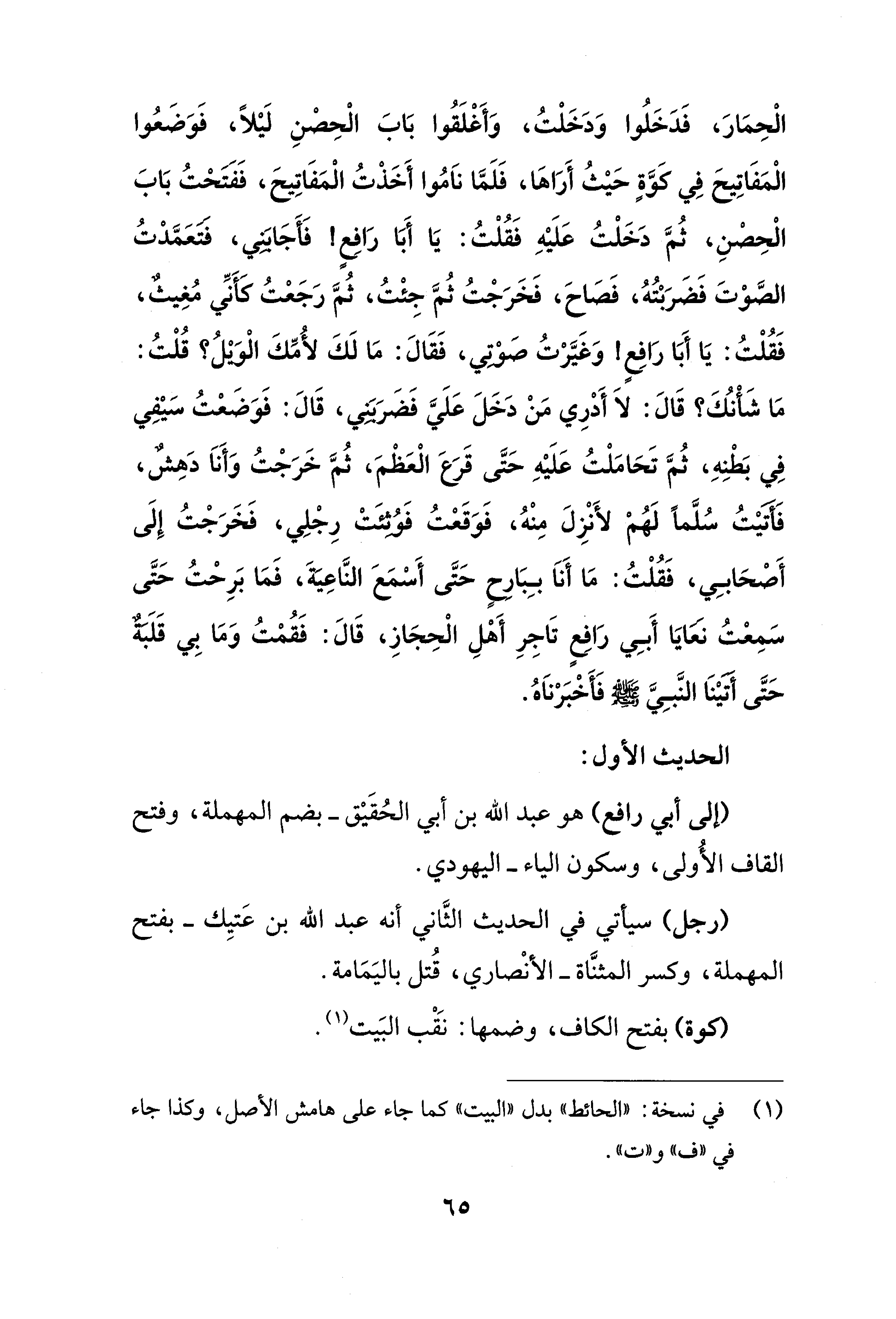 الْحِمَارَ، فَدَخَلُوا وَدَخَلْتُ، وَأَغْلَقُوا بَابَ الْحِصْنِ لَيْلًا، فَوَضَعُوا الْمَفَاتِيحَ فِي كَوَّةٍ حَيْثُ أَرَاهَا، فَلَمَّا نَامُوا أَخَذْتُ الْمَفَاتِيحَ، فَفَتَحْتُ بَابَ الْحِصْنِ، ثُمَّ دَخَلْتُ عَلَيْهِ فَقُلْتُ: يَا أَبَا رَافِعٍ! فَأَجَابَنِي، فَتَعَمَّدْتُ الصَّوْتَ فَضَرَبْتُهُ، فَصَاحَ، فَخَرَجْتُ ثُمَّ جِئْتُ، ثُمَّ رَجَعْتُ كَأَنِّي مُغِيثٌ، فَقُلْتُ: يَا أَبَا رَافِعٍ! وَغَيَّرْتُ صَوْتِي، فَقَالَ: مَا لَكَ لأُمِّكَ الْوَيْلُ؟ قُلْتُ: مَا شَأْنُكَ؟ قَالَ: لاَ أَدْرِي مَنْ دَخَلَ عَلَيَّ فَضَرَبَنِي، قَالَ: فَوَضَعْتُ سَيْفِي فِي بَطْنِهِ، ثُمَّ تَحَامَلْتُ عَلَيْهِ حَتَّى قَرَعَ الْعَظْمَ، ثُمَّ خَرَجْتُ وَأَناَ دَهِشٌ، فَأَتَيْتُ سُلَّمًا لَهُمْ لأَنْزِلَ مِنْهُ، فَوَقَعْتُ فَوُثِئَتْ رِجْلِي، فَخَرَجْتُ إِلَى أَصْحَابِي، فَقُلْتُ: مَا أَناَ بِبَارِحٍ حَتَّى أَسْمَعَ النَّاعِيَةَ، فَمَا بَرِحْتُ حَتَّى سَمِعْتُ نَعَايَا أَبِي رَافِعٍ تَاجِرِ أَهْلِ الْحِجَازِ، قَالَ: فَقُمْتُ وَمَا بِي قَلَبَةٌ حَتَّى أَتَيْنَا النَّبِيَّ صَلَّى الله عَلَيْهِ وَسَلَّمُ فَأَخْبَرْناَهُ.
