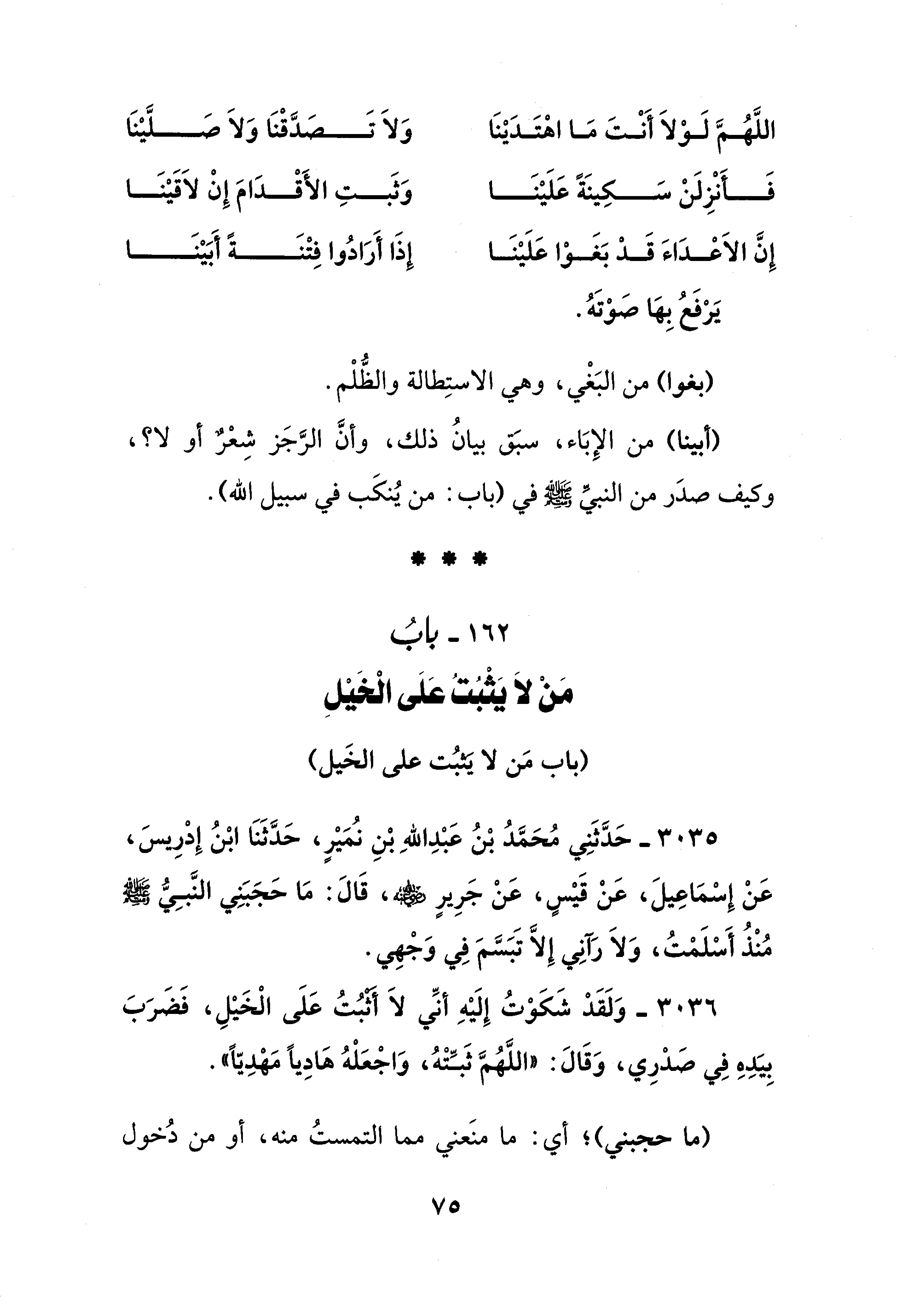 3036 - وَلَقَدْ شَكَوْتُ إِلَيْهِ أنِّي لاَ أَثْبُتُ عَلَى الْخَيْلِ، فَضَرَبَ بِيَدِهِ فِي صَدْرِي، وَقَالَ: "اللَّهُمَّ ثَبِّتْهُ، وَاجْعَلْهُ هَادِيًا مَهْدِيًّا".