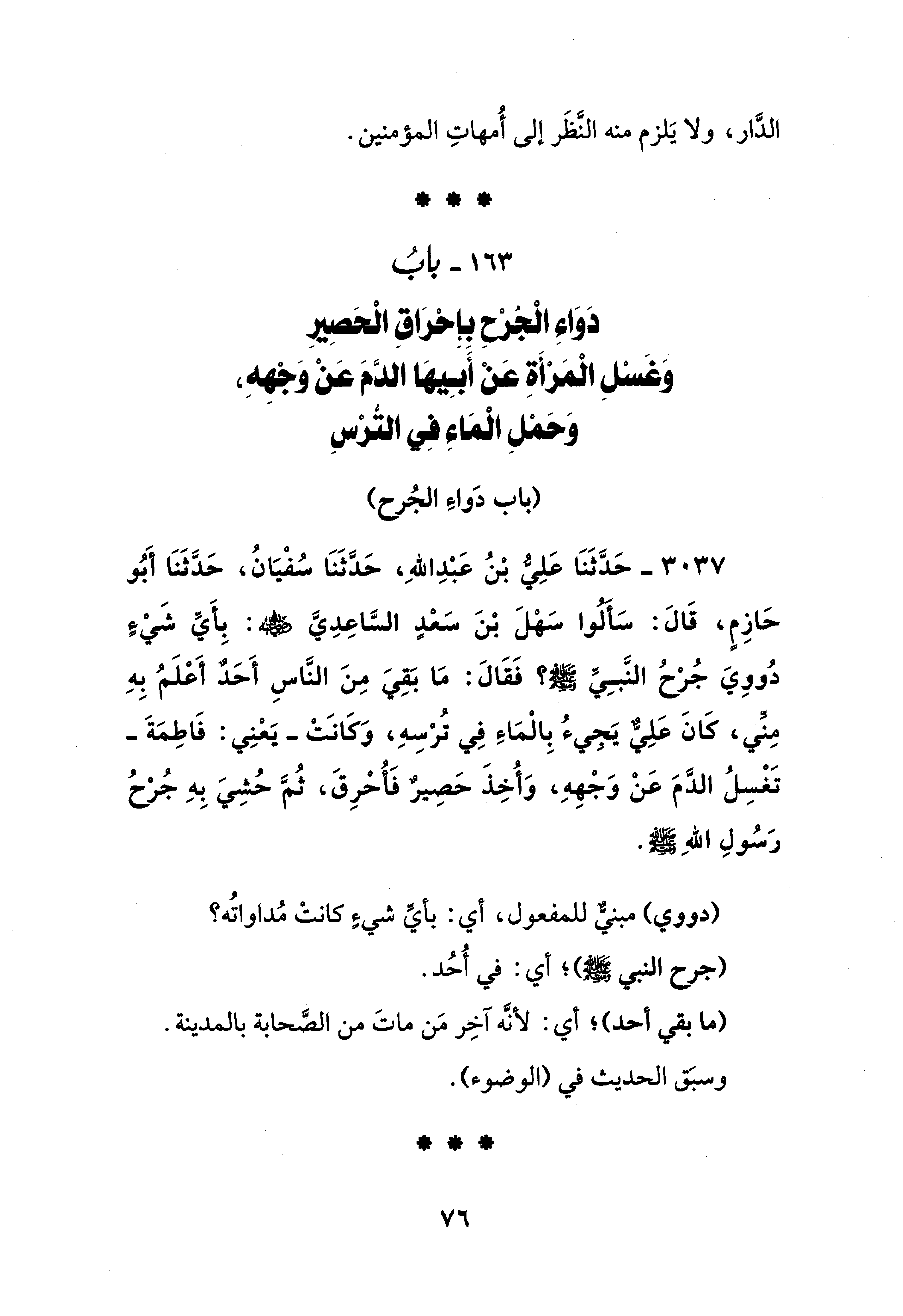 3037 - حَدَّثَنَا عَلِيُّ بْنُ عَبْدِ اللهِ، حَدَّثَنَا سُفْيَانُ، حَدَّثَنَا أَبُو حَازِمٍ، قَالَ: سَأَلُوا سَهْلَ بْنَ سَعْدٍ السَّاعِدِيَّ - رضي الله عنه -: بِأَيِّ شَيْء دُووِيَ جُرْحُ النَّبِيِّ - صلى الله عليه وسلم -؟ فَقَالَ: مَا بَقِيَ مِنَ النَّاسِ أَحَدٌ أَعْلَمُ بِهِ مِنِّي، كَانَ عَلِيٌّ يَجيءُ بِالْمَاءِ فِي تُرْسِهِ، وَكَانَتْ -يَعْنِي: فَاطِمَةَ- تَغْسِلُ الدَّمَ عَنْ وَجْهِهِ، وَأُخِذَ حَصِيرٌ فَأُحْرِقَ، ثُمَّ حُشِيَ بِهِ جُرْحُ رَسُولِ اللهِ - صلى الله عليه وسلم -.