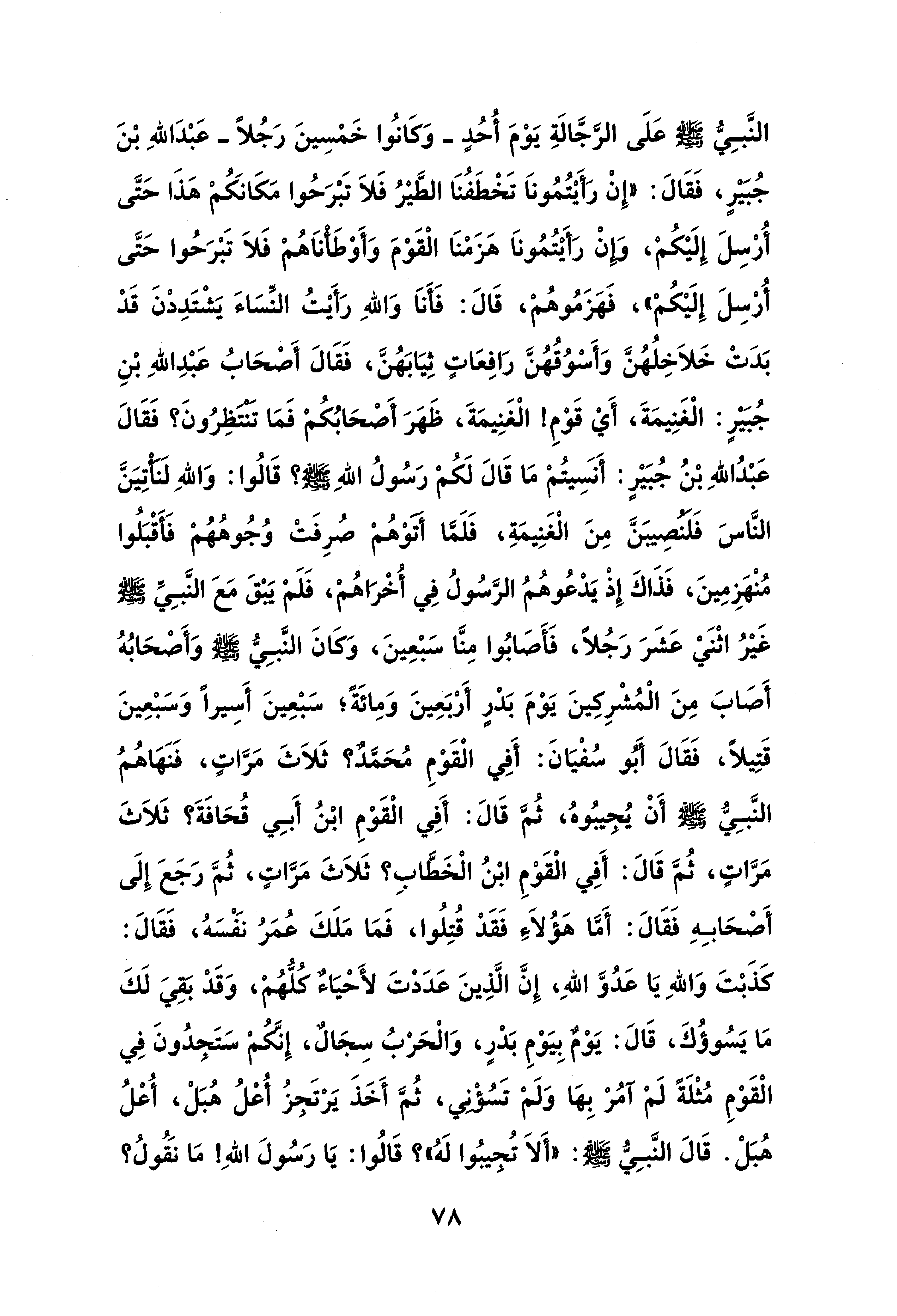 النَّبِيُّ - صلى الله عليه وسلم - عَلَى الرَّجَّالَةِ يَوْمَ أُحُدٍ -وَكَانُوا خَمْسِينَ رَجُلًا- عَبْدَ اللهِ بْنَ جُبَيْرٍ، فَقَالَ: "إِنْ رَأَيْتُمُوناَ تَخْطَفُنَا الطَّيْرُ فَلاَ تَبْرَحُوا مَكَانَكُمْ هَذَا حَتَّى أُرْسِلَ إِلَيْكُمْ، وَإِنْ رَأَيْتُمُوناَ هَزَمْنَا الْقَوْمَ وَأَوْطَأْناَهُمْ فَلاَ تَبْرَحُوا حَتَّى أُرْسِلَ إِلَيْكُمْ"، فَهَزَمُوهُمْ، قَالَ: فَأَناَ وَاللهِ رَأَيْتُ النِّسَاءَ يَشْتَدِدْنَ قَدْ بَدَتْ خَلاَخِلُهُنَّ وَأَسْوُقُهُنَّ رَافِعَاتٍ ثِيَابَهُنَّ، فَقَالَ أَصْحَابُ عَبْدِ اللهِ بْنِ جُبَيْرٍ: الْغَنِيمَةَ، أَيْ قَوْمِ! الْغَنِيمَةَ، ظَهَرَ أَصْحَابُكُمْ فَمَا تنتَظِرُونَ؟ فَقَالَ عَبْدُ اللهِ بْنُ جُبَيْرٍ: أَنَسِيتُمْ مَا قَالَ لَكُمْ رَسُولُ اللهِ - صلى الله عليه وسلم - قَالُوا: وَاللهِ لَنَأْتِيَنَّ النَّاسَ فَلَنُصِيَبَنَّ مِنَ الْغَنِيمَةِ، فَلَمَّا أَتَوْهُمْ صُرِفَتْ وُجُوهُهُمْ فَأَقْبَلُوا مُنْهَزِمِينَ، فَذَاكَ إِذْ يَدْعُوهُمُ الرَّسُولُ فِي أُخْرَاهُمْ، فَلَمْ يَبْقَ مَعَ النَّبِيِّ - صلى الله عليه وسلم - غَيْرُ اثْنَيْ عَشَرَ رَجُلًا، فَأَصَابُوا مِنَّا سَبْعِينَ، وَكَانَ النَّبِيُّ - صلى الله عليه وسلم - وَأَصْحَابُهُ أَصَابَ مِنَ الْمُشْرِكينَ يَوْمَ بَدْرٍ أَرْبَعِينَ وَمِائَةً؛ سَبْعِينَ أَسِيرًا وَسَبْعِينَ قَتِيلًا، فَقَالَ أَبُو سُفْيَانَ: أَفِي الْقَوْمِ مُحَمَّدٌ؟ ثَلاَثَ مَرَّاتٍ، فَنَهَاهُمُ النَّبِيُّ - صلى الله عليه وسلم - أَنْ يُجِيبُوهُ، ثُمَّ قَالَ: أَفِي الْقَوْمِ ابْنُ أَبِي قُحَافَةَ؟ ثَلاَثَ مَرَّات، ثُمَّ قَالَ: أَفِي الْقَوْمِ ابْنُ الْخَطَّابِ؟ ثَلاَثَ مَرَّاتٍ، ثُمَّ رَجَعَ إِلَى أَصْحَابِهِ فَقَالَ: أَمَّا هَؤُلاَءِ فَقَدْ قُتِلُوا، فَمَا مَلَكَ عُمَرُ نفسَهُ، فَقَالَ: كَذَبْتَ وَاللهِ يَا عَدُوَّ اللهِ، إِنَّ الَّذِينَ عَدَدْتَ لأَحْيَاءٌ كُلُّهُمْ، وَقَدْ بَقِيَ لَكَ مَا يَسُوؤُكَ، قَالَ: يَوْمٌ بِيَوْمِ بَدْرٍ، وَالْحَرْبُ سِجَالٌ، إِنَّكمْ سَتَجدُونَ فِي الْقَوْمِ مُثْلَةً لَمْ آمُرْ بِهَا وَلَمْ تَسُؤْنِي، ثُمَّ أَخَذَ يَرْتَجزُ أُعْلُ هُبَلْ، أُعْلُ هُبَلْ. قَالَ النَّبِيُّ - صلى الله عليه وسلم -: "أَلاَ تُجيبُوا لَهُ"؟ قَالُوا: يَا رَسُولَ اللهِ مَا نقُولُ؟
