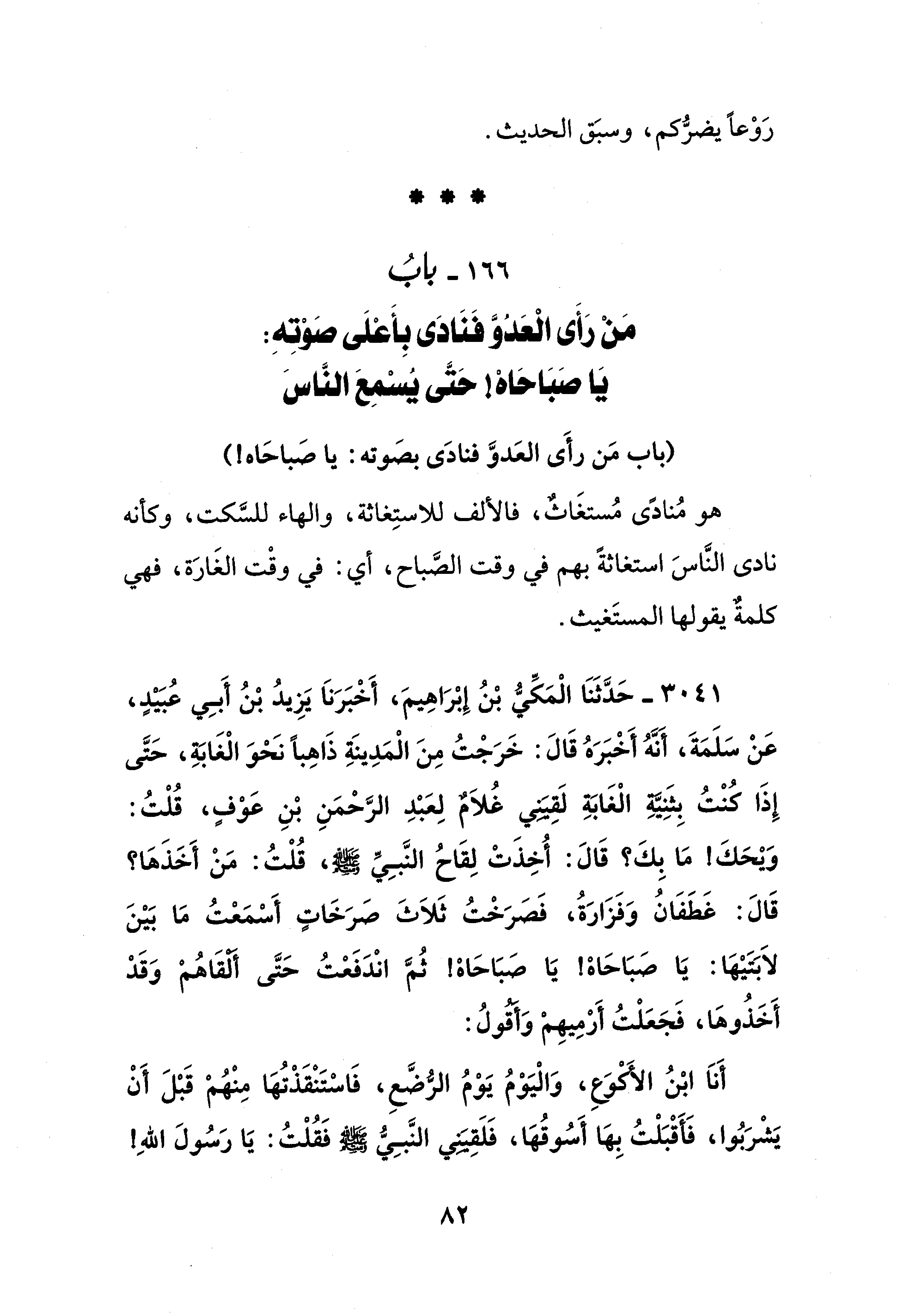166 - بابُ مَنْ رَأَى الْعَدُوَّ فَنَادَى بأَعْلَى صَوْتِهِ: يَا صَبَاحَاهْ! حَتَّى يُسْمِعَ النَّاسَ