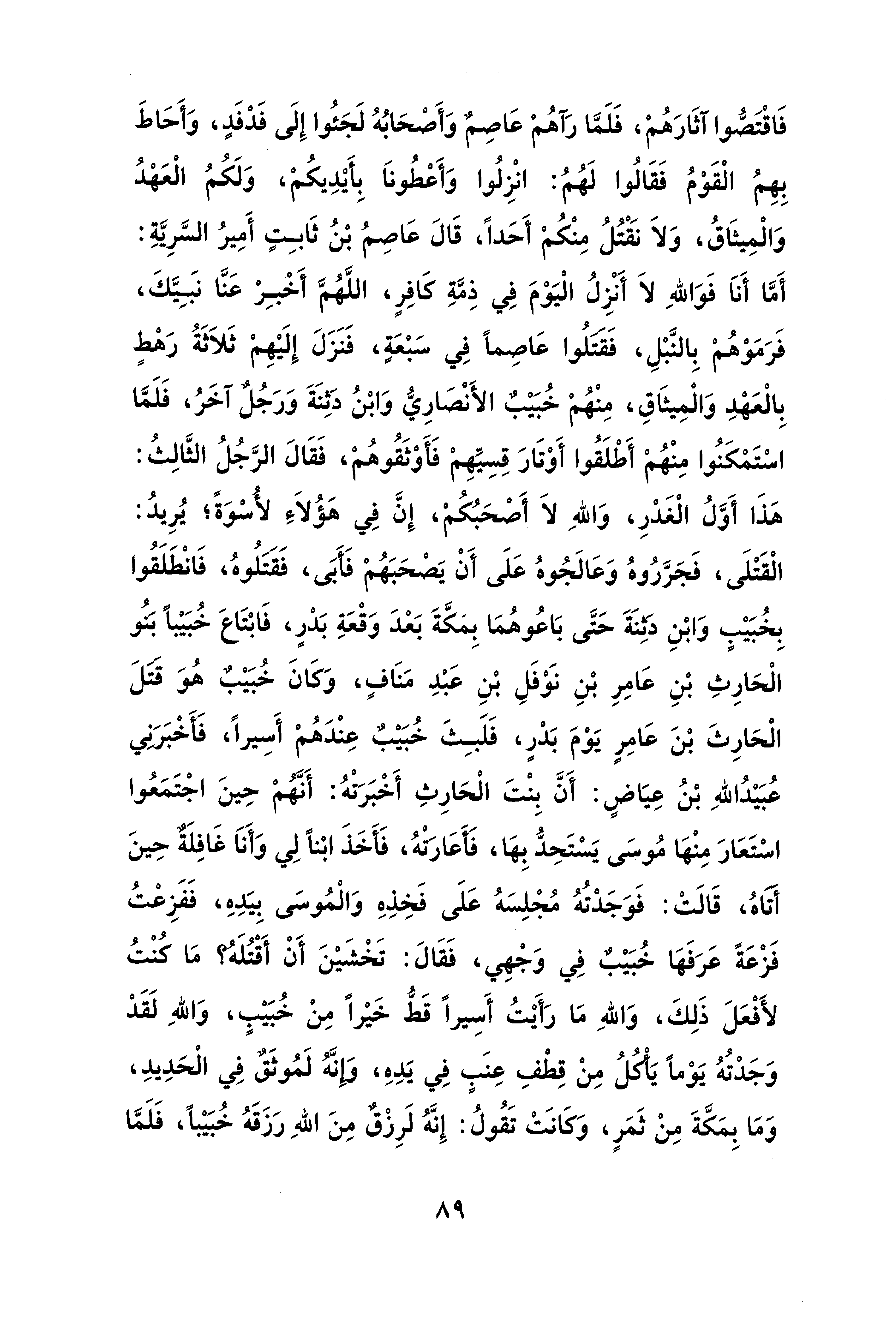 فَاقْتَصُّوا آثَارَهُمْ، فَلَمَّا رَآهُمْ عَاصِمٌ وَأَصْحَاُبهُ لَجَئُوا إِلَى فَدْفَدٍ، وَأَحَاطَ بِهِمُ الْقَوْمُ فَقَالُوا لَهُمُ: انْزِلُوا وَأَعْطُونَا بِأَيْدِيكُمْ، وَلَكُمُ الْعَهْدُ وَالْمِيثَاقُ، وَلَا نَقْتُلُ مِنْكُمْ أَحَدًا، قَالَ عَاصِمُ بْنُ ثَابِتٍ أَمِيرُ السَّرِيَّةِ: أَمَّا أَنَا فَوَاللهِ لا أَنْزِلُ الْيَوْمَ فِي ذِمَّةِ كَافِرٍ، اللَّهُمَّ أَخْبِرْ عَنَّا نبَيَّكَ، فَرَمَوْهُمْ بِالنَّبْلِ، فَقَتَلُوا عَاصِمًا فِي سَبْعَةٍ، فَنَزَلَ إِلَيْهِمْ ثَلًاثَةُ رَهْطٍ بِالْعَهْدِ وَالْمِيثَاقِ، مِنْهُمْ خُبَيْبٌ الأَنْصَارِيُّ وَابْنُ دَثِنَةَ وَرَجُلٌ آخَرُ، فَلَمَّا اسْتَمْكَنُوا مِنْهُمْ أَطْلَقُوا أَوْتَارَ قِسِيِّهِمْ فَأَوْثَقُوهُمْ، فَقَالَ الرَّجُلُ الثَّالِثُ: هَذَا أَوَّلُ الْغَدْرِ، وَاللهِ لا أَصْحَبُكُمْ، إِنَّ فِي هَؤلاء لأُسْوَةً؛ يُرِيدُ: الْقَتْلَى، فَجَرَّرُوهُ وَعَالَجُوهُ عَلَى أَنْ يَصْحَبَهُمْ فَأَبَى، فَقَتَلُوهُ، فَانْطَلَقُوا بِخُبَيْبٍ وَابْنِ دثِنَةَ حَتَّى بَاعُوهُمَا بِمَكَّةَ بَعْدَ وَقْعَةِ بَدْرٍ، فَابْتَاعَ خُبَيْبًا بَنُو الْحَارِثِ بْنِ عَامِرِ بْنِ نَوْفَلِ بْنِ عَبْدِ مَنَافٍ، وَكَانَ خُبَيْبٌ؛ هُوَ قتلَ الْحَارِثَ بْنَ عَامِرٍ يَوْمَ بَدْرٍ، فَلَبِثَ خُبَيْبٌ عِنْدَهُمْ أَسِيرًا، فَأَخْبَرَنِي عُبَيْدُ اللهِ بْنُ عِيَاضٍ: أَنَّ بِنْتَ الْحَارِثِ أَخْبَرتْهُ: أَنَّهُمْ حِينَ اجْتَمَعُوا اسْتَعَارَ مِنْهَا مُوسَى يَسْتَحِدُّ بِهَا، فَأَعَارَتْهُ، فَأَخَذَ ابْنًا لِي وَأَنَا غَافِلَةٌ حِينَ أَتَاهُ، قَالَتْ: فَوَجَدْتُهُ مُجْلِسَهُ عَلَى فَخِذِهِ وَالْمُوسَى بِيَدِهِ، فَفَزِعْتُ فَزْعَةً عَرَفَهَا خُبَيْبٌ فِي وَجْهِي، فَقَالَ: تَخْشَيْنَ أَنْ أَقْتُلَهُ؟ مَا كُنْتُ لأَفْعَلَ ذَلِكَ، وَاللهِ مَا رَأَيْتُ أَسِيرًا قَطُّ خَيْرًا مِنْ خُبَيْبٍ، وَاللهِ لَقَدْ وَجَدْتُهُ يَوْمًا يَأْكُلُ مِنْ قِطْفِ عِنَبٍ فِي يَدِهِ، وَإِنَّهُ لَمُوثَقٌ فِي الْحَدِيدِ، وَمَا بِمَكَّةَ مِنْ ثَمَرٍ، وَكَانَتْ تَقُولُ: إِنَّهُ لَرِزْقٌ مِنَ اللهِ رَزَقَهُ خُبَيْبًا، فَلَمَّا