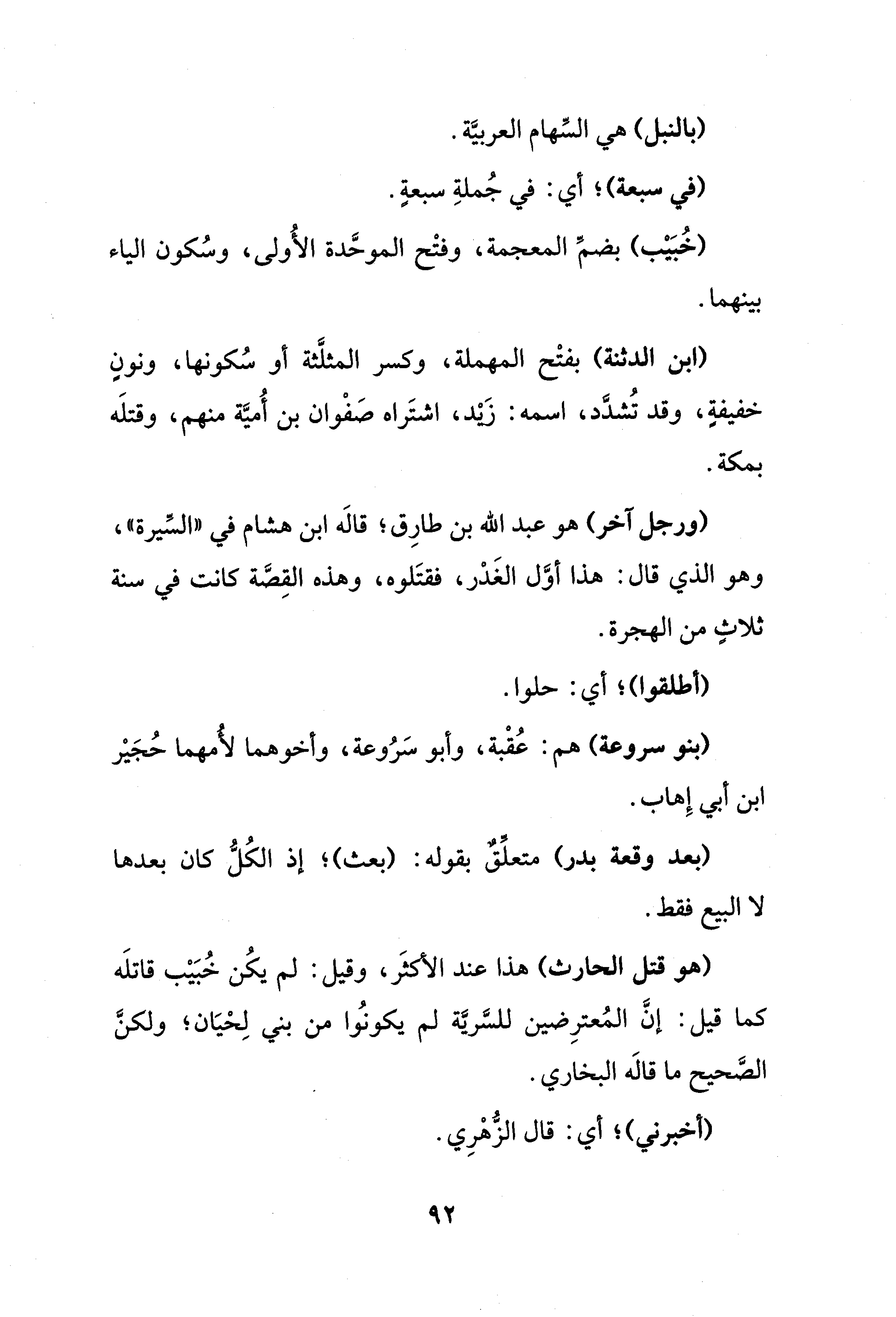 (ورجل آخر) هو عبد الله بن طارِق؛ قالَه ابن هشام في "السِّيرة"، وهو الذي قال: هذا أوَّل الغَدْر، فقتَلوه، وهذه القِصَّة كانت في سنة ثلاث من الهجرة.