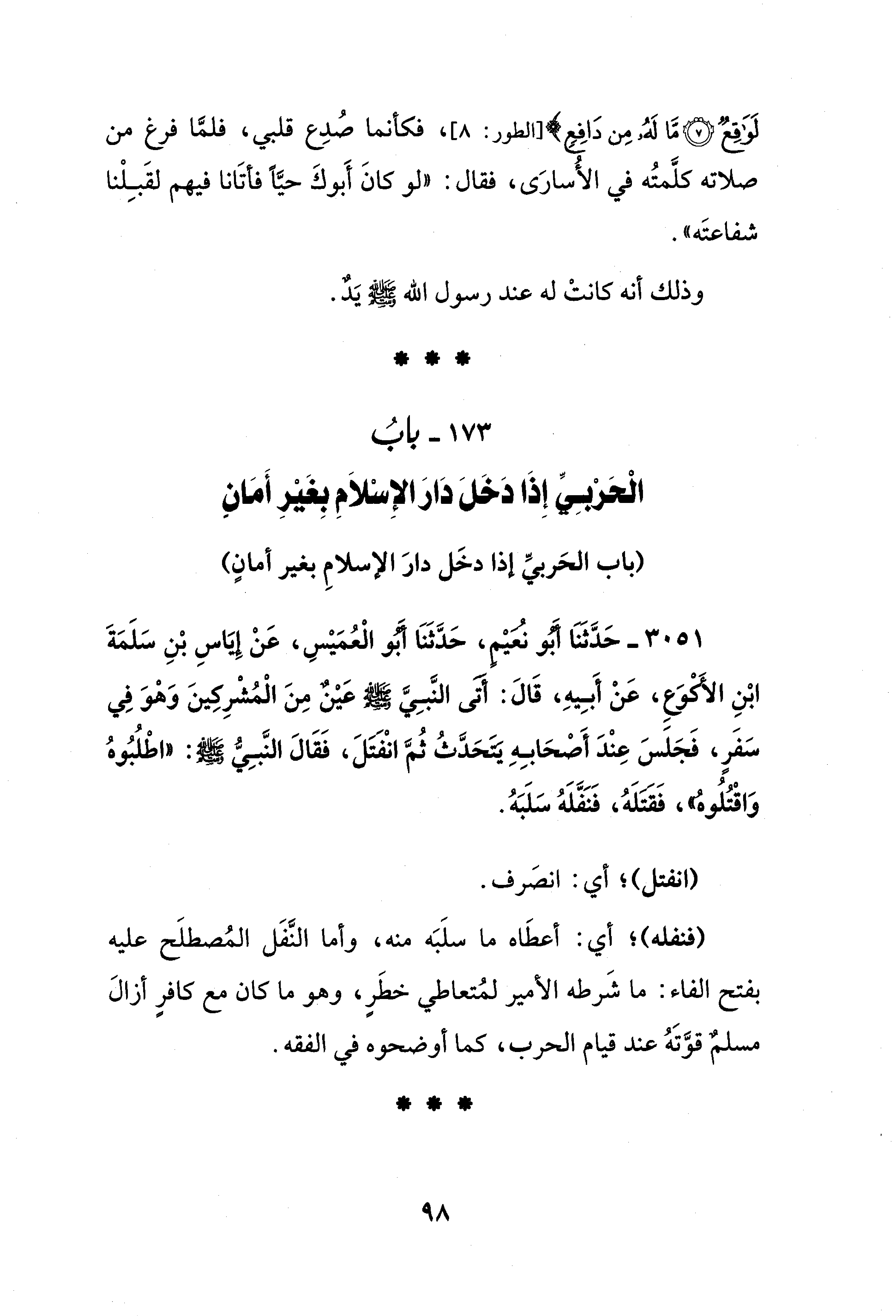 3051 - حَدَّثَنَا أَبُو نُعَيْمٍ، حَدَّثَنَا أَبُو الْعُمَيْسِ، عَنْ إِيَاسِ بْنِ سَلَمَةَ ابْنِ الأَكْوَعِ، عَنْ أَبِيهِ، قَالَ: أتى النَّبِيَّ - صلى الله عليه وسلم - عَيْنٌ مِنَ الْمُشْرِكِينَ وَهْوَ فِي سَفَرِ، فَجَلَسَ عِنْدَ أَصْحَابِهِ يَتَحَدَّثُ ثُمَّ انْفَتَلَ، فَقَالَ النَّبِيُّ - صَلَّى الله عَلَيْهِ وَسَلَّمَ -: "اطْلُبُوهُ وَاقْتُلُوهُ"، فَقَتَلَهُ، فَنَفَّلَهُ سَلَبَهُ.