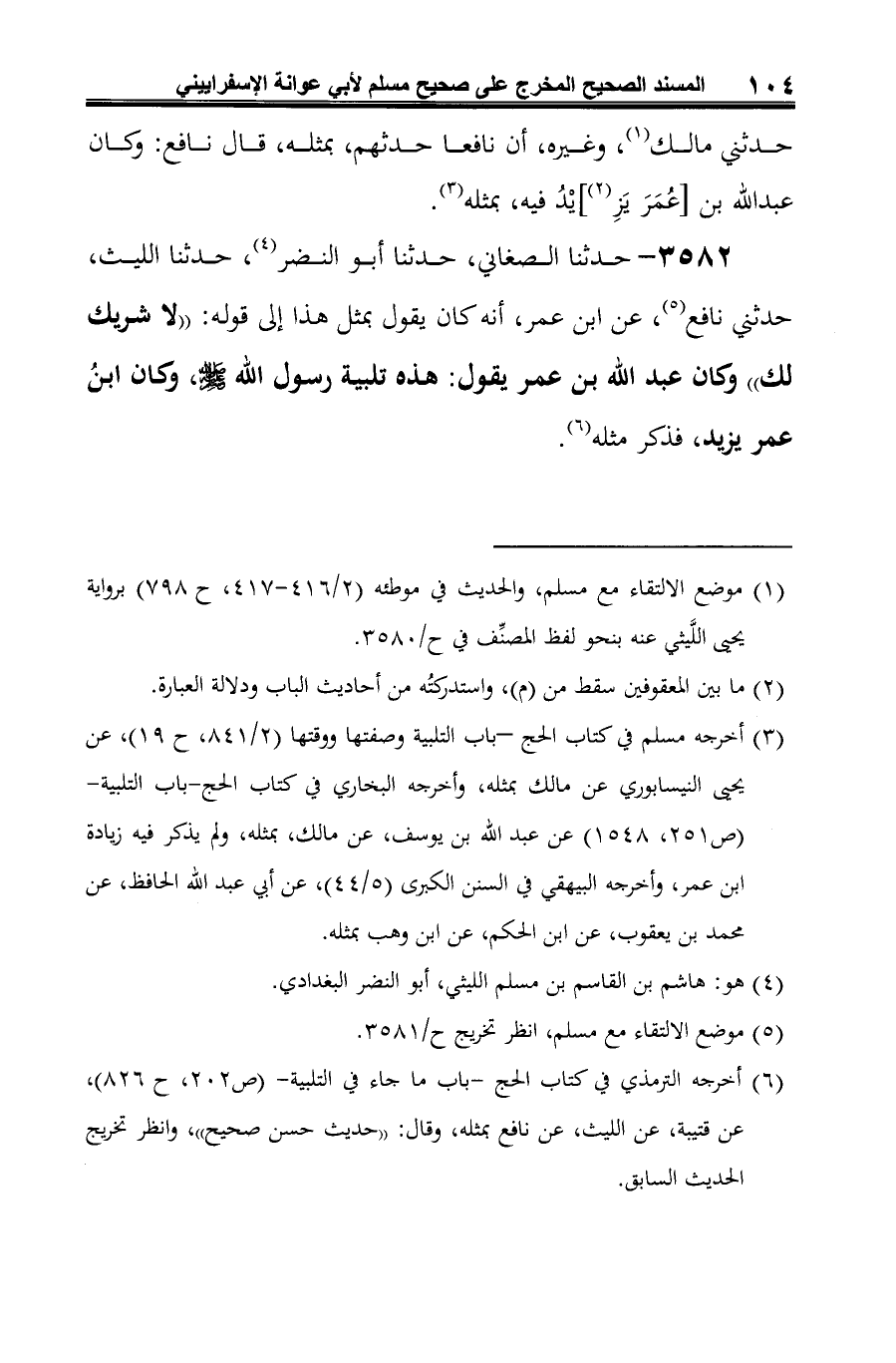 3582 - حدثنا الصغاني، حدثنا أبو النضر (¬1)، حدثنا الليث، حدثني نافع (¬2)، عن ابن عمر، أنه كان يقول بمثل هذا إلى قوله: "لا شريك لك" وكان عبد الله بن عمر يقول: هذه تلبية رسول الله -صلى الله عليه وسلم-، وكان ابنُ عمر يزيد، فذكر مثله (¬3).