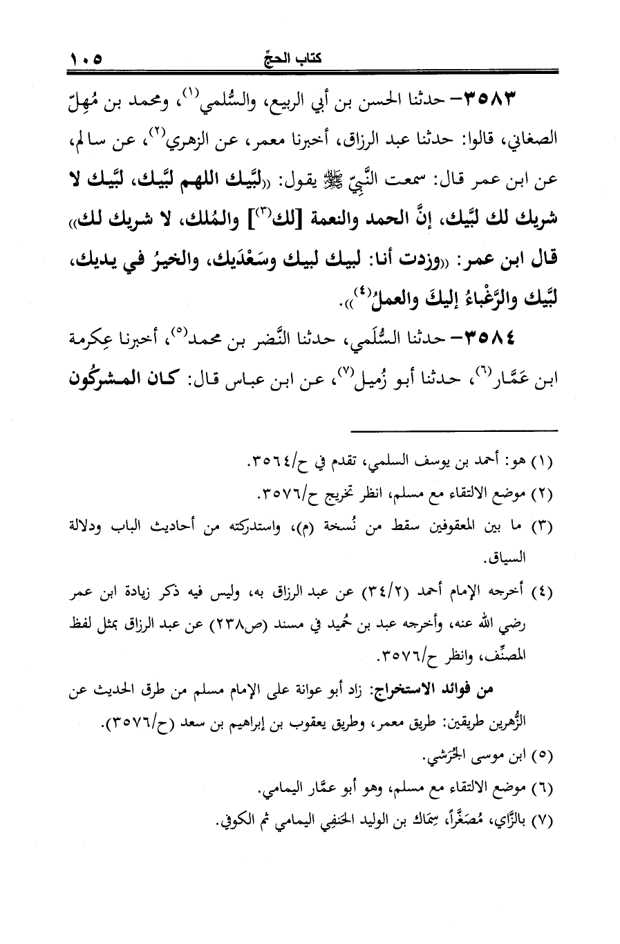 3583 - حدثنا الحسن بن أبي الرَّبيع، والسُّلمي (¬1)، ومحمد بن مُهِلّ الصغاني، قالوا: حدثنا عبد الرزاق، أخبرنا معمر، عن الزهري (¬2)، عن سالم، عن ابن عمر قال: سمعت النَّبِيّ -صلى الله عليه وسلم- يقول: "لبَّيك اللهم لبَّيك، لبَّيك لا شريك لك لبَّيك، إنَّ الحمد والنعمة [لك (¬3)] والمُلك، لا شريك لك" قال ابن عمر: "وزدت أنا: لبيك لبيك وسَعْدَيك، والخيرُ في يديك، لبَّيك والرَّغْباءُ إليكَ والعملُ (¬4) ".