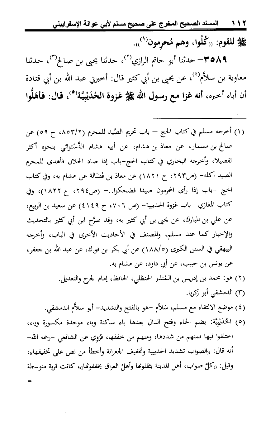 3589 - حدثنا أبو حاتم الرازي (¬1)، حدثنا يحيى بن صالح (¬2)، حدثنا معاوية بن سلَّام (¬3)، عن يحيى بن أبي كثير قال: أخبرني عبد الله بن أبي قتادة أن أباه أخبره، أنه غزا مع رسول الله -صلى الله عليه وسلم- غزوة الحُدَيْبِيَّة (¬4)، قال: فأهَلُّوا