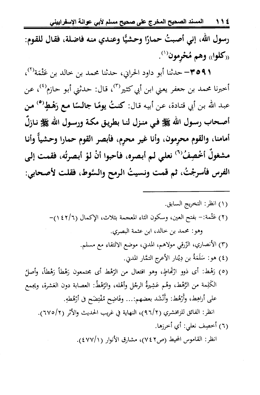 (¬8) أخرجه مسلم في كتاب الحج -باب تحريم الصيد للمحرم (2/ 855، ح 63)، عن أحمد بن عبدة، عن فضيل بن سليمان النميرى، عن أبي حازم، به مختصرًا، بينما رواه أبو عوانة مطوَّلًا، وأخرجه البخاريّ في كتاب الجهاد -باب اسم الفرس والحمار- (ص 472، ح 2854) عن محمد بن أبي بكر، عن فضيل بن سليمان، وفي كتاب الأطعمة -باب تعرُّق العَضُد (ص 965، ح 5406)، عن محمد بن المثنى، عن عثمان بن عمر، عن فليح بن سليمان، وفي الباب نفسه، وفي كتاب الهبة -باب فضل الهبة (ص 415، ح 2567)، عن عبد العزيز بن عبد الله، عن محمد بن جعفر ابن أبي كثير، ثلاثتهم عن أبي حازم به.