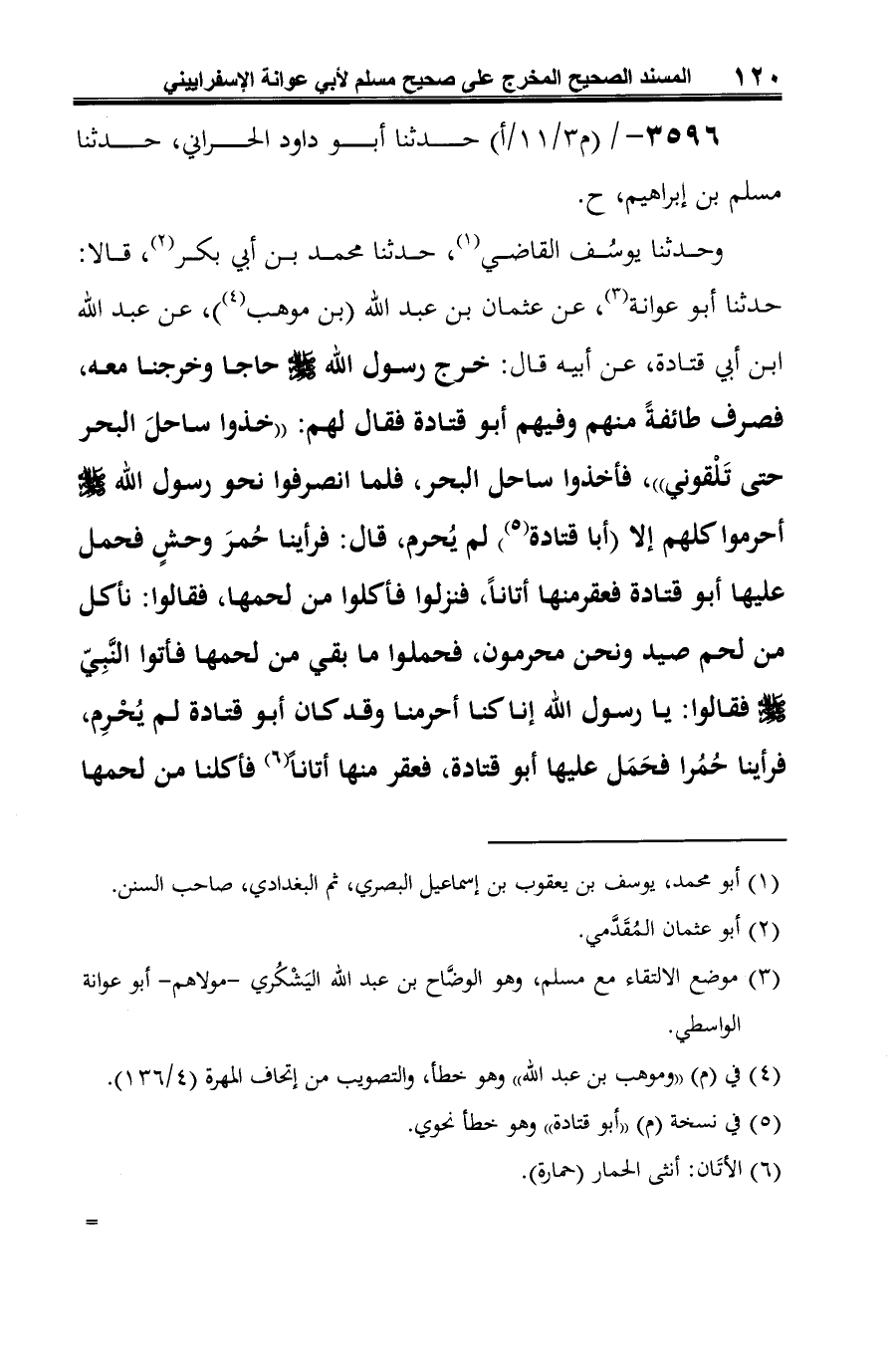 (¬7) أخرجه مسلمٌ في كتاب الحج -باب التحريم الصيد للمحرم (2/ 853، ح 60)، عن أبي كامل الجحدري، عن أبي عوانة بمثله، وأخرجه البخاري عن موسى ابن إسماعيل عن أبي عوانة به، وأخرجه البيهقي في السنن الكبرى (5/ 331) عن علي ابن محمد المقرئ عن الحسن بن محمد عن يوسف القاضي عن محمد بن أبي بكر عن أبي عوانة بمثله.