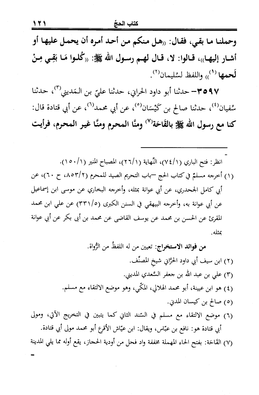 3597 - حدثنا أبو داود الحراني، حدثنا عليّ بن المَديني (¬1)، حدثنا سُفيان (¬2)، حدثنا صالح بن كَيْسَان (¬3)، عن أبي محمد (¬4)، عن أبي قتادة قال: كنا مع رسول الله -صلى الله عليه وسلم- بالقَاحَة (¬5) ومنَّا المحرم ومنَّا غير المحرم، فرأيت
