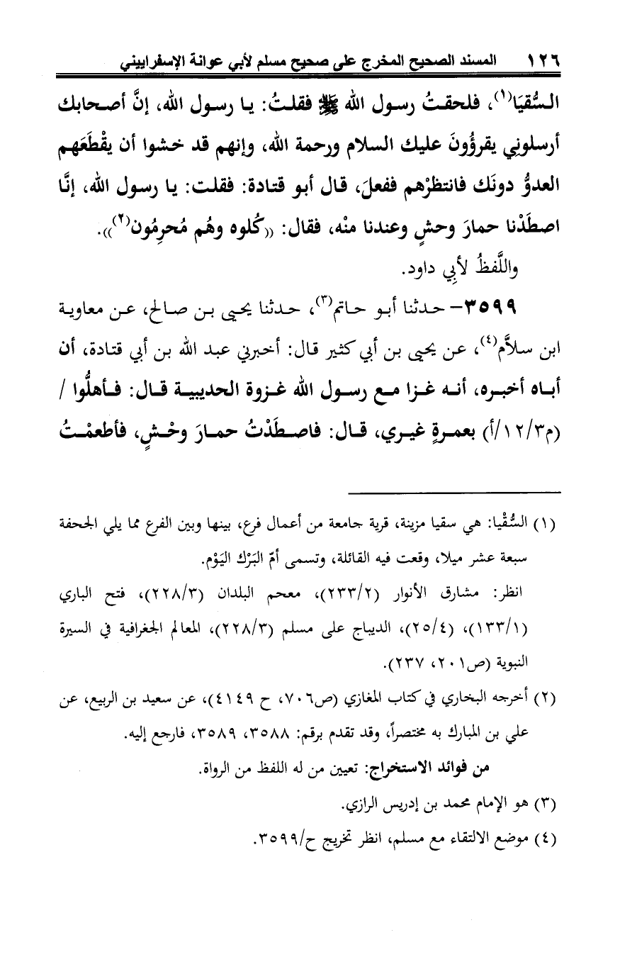 (¬3) تقدم الحديث برقم: 3599، وهو ممَّا يكرِّره أبو عوانة من الأحاديث التي لها مناسبة مع أكثر من باب، فحين يضيق عليه المخرج يكرر الحديث من الطريق نفسه في باب آخر، وذلك لاستنباط الأحكام الفقهية منه.
