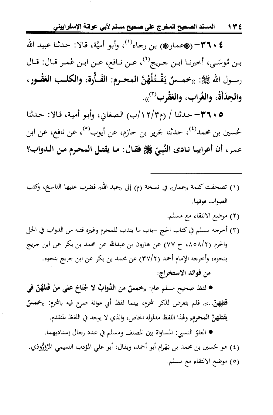 (¬3) أخرجه مسلم في كتاب الحج -باب ما يندب للمحرم وغيره قتله من الدواب في الحل والحرم (2/ 859، ح 77)، عن أبي كامل عن حمَّاد عن أيُّوب به، محيلًا لفظَه على لفظ مالك وابن جريج عن نافع السابق، وليس في طريق مالك، وابن جريج، عند مسلم سؤال الرواة عن الحيَّات، ولم أقف على رواية جرير عن أيُّوب في غير مستخرج أبي عوانة.