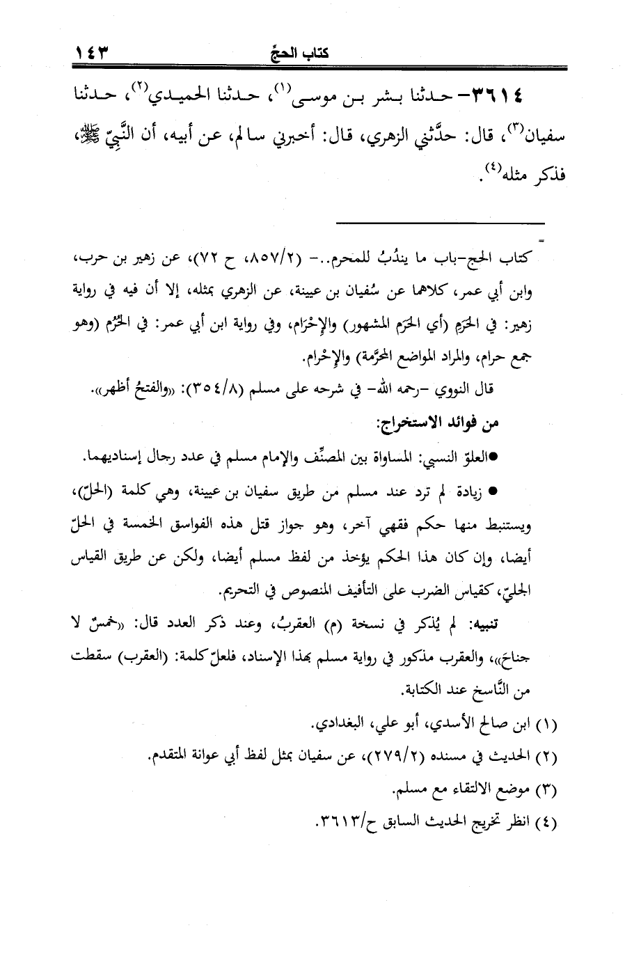 3614 - حدثنا بشر بن موسى (¬1)، حدثنا الحميدي (¬2)، حدثنا سفيان (¬3)، قال: حدَّثني الزهري، قال: أخبرني سالم، عن أبيه، أن النَّبِيّ -صلى الله عليه وسلم-، فذكر مثله (¬4).