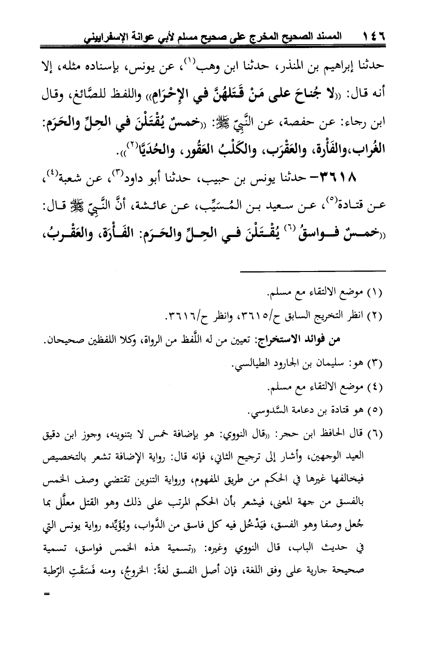 (¬6) أخرجه مسلم في كتاب الحج -باب ما يندب للمحرم وغيره قتله من الدواب- (2/ 856، 67) عن أبي بكر بن أبي شيبة، وابن المثنى، وابن بشار، ثلاثتهم عن غُنْدَر، عن شعبة، عن قتادة به، بمثل لفظ أبي عوانة، إلا أن فيه الحيَّة بَدَلَ العَقْرَب، ويظهر لي -والله أعلم- أن ذكر (الحيّة) بدل (العَقْرب) غير محفوظ، وذلك لما يأتي: