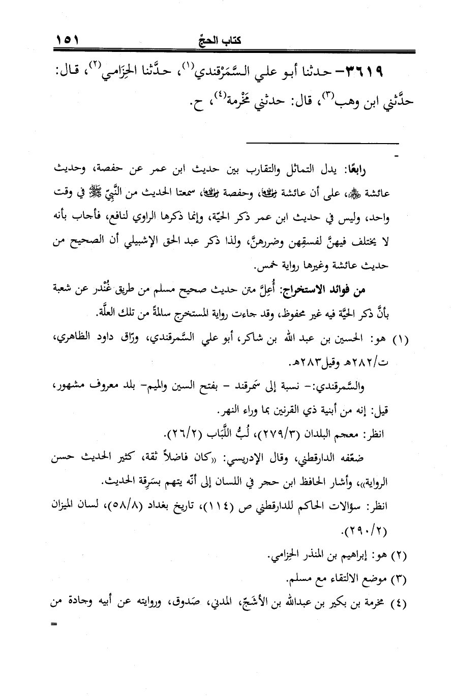 3619 - حدثنا أبو علي السَّمَرْقندي (¬1)، حدَّثنا الحِزَامي (¬2)، قال: حدَّثني ابن وهب (¬3)، قال: حدثني مَخْرمة (¬4)، ح.