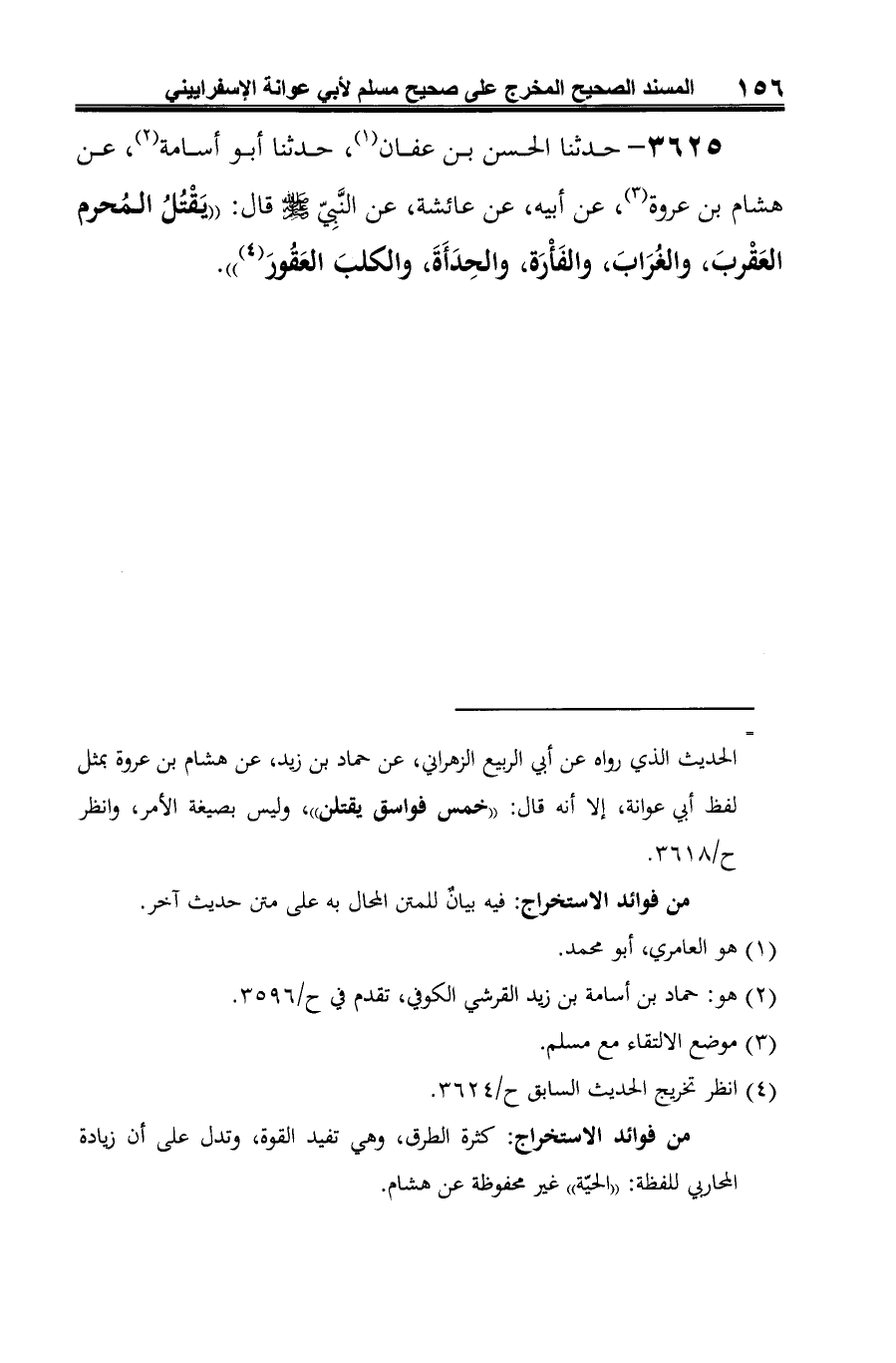 3625 - حدثنا الحسن بن عفان (¬1)، حدثنا أبو أسامة (¬2)، عن هشام بن عروة (¬3)، عن أبيه، عن عائشة، عن النَّبِيّ -صلى الله عليه وسلم- قال: "يَقْتُلُ المُحرم العَقْربَ، والغُرَابَ، والفَأْرَة، والحِدَأَةَ، والكلبَ العَقُورَ (¬4) ".