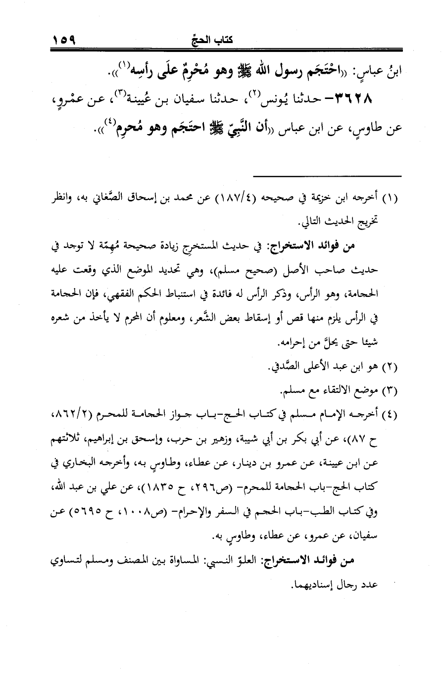 (¬3) أخرجه الإمام مسلم في كتاب الحج -باب جواز الحجامة للمحرم (2/ 862، ح 87)، عن أبي بكر بن أبي شيبة، وزهير بن حرب، وإسحق بن إبراهيم، ثلاثتهم عن ابن عيينة، عن عمرو بن دينار، عن عطاء، وطاوسٍ به، وأخرجه البخاري في كتاب الحج -باب الحجامة للمحرم- (ص 296، ح 1835)، عن علي بن عبد الله، وفي كتاب الطب -باب الحجم في السفر والإحرام- (ص 1008، ح 5695) عن سفيان، عن عمرو، عن عطاء، وطاوسٍ به.