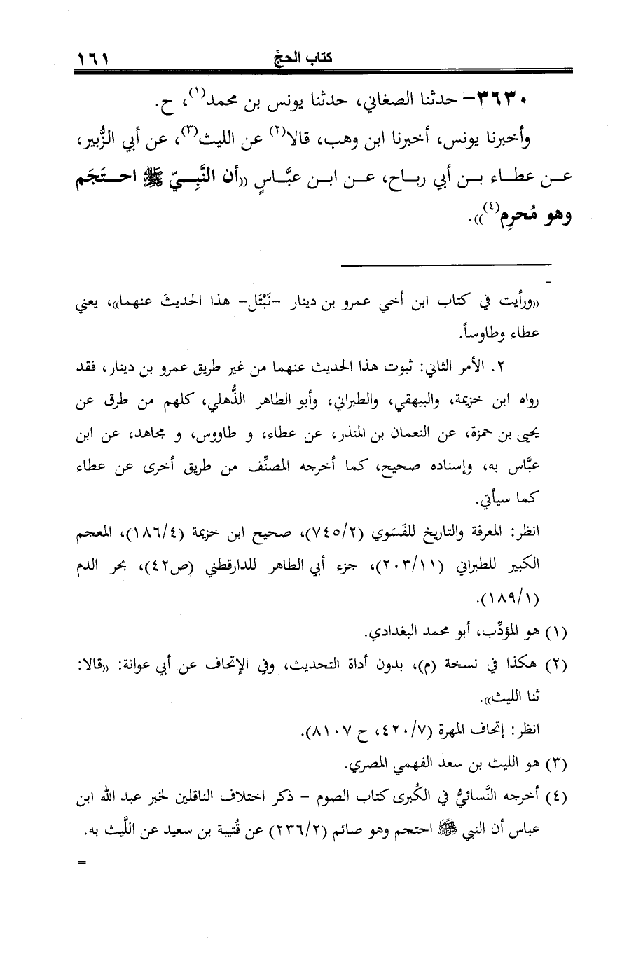 (¬4) أخرجه النَّسائيُّ في الكُبرى كتاب الصوم- ذكر اختلاف الناقلين لخبر عبد الله ابن عباس أن النبي -صلى الله عليه وسلم- احتجم وهو صائم (2/ 236) عن قُتيبة بن سعيد عن اللَّيث به. =
