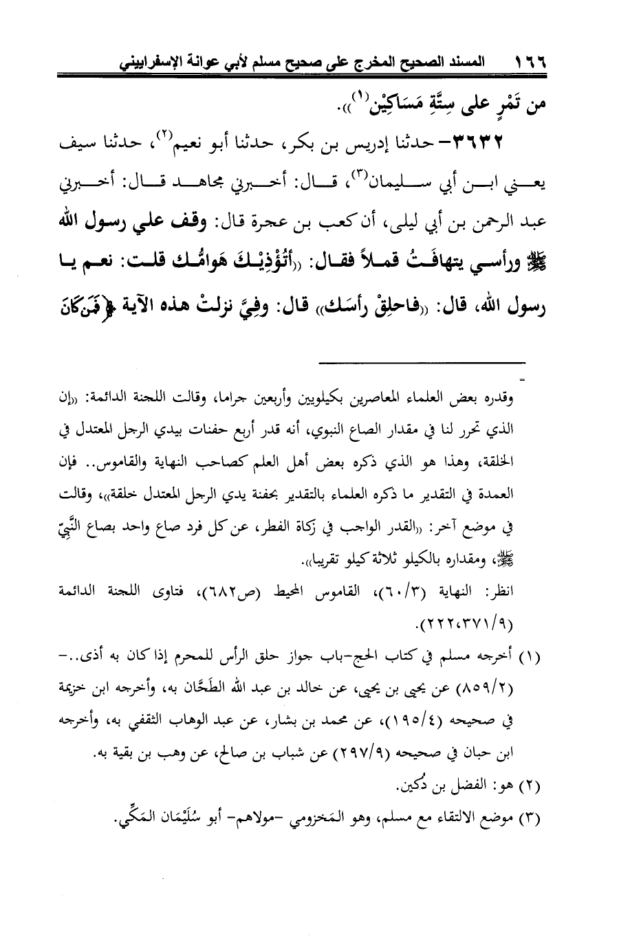 3632 - حدثنا إدريس بن بكر، حدثنا أبو نعيم (¬1)، حدثنا سيف يعني ابن أبي سليمان (¬2)، قال: أخبرني مجاهد قال: أخبرني عبد الرحمن بن أبي ليلى، أن كعب بن عجرة قال: وقف علي رسول الله -صلى الله عليه وسلم- ورأسي يتهافَتُ قملًا فقال: "أتُؤْذِيْكَ هَوامُّك قلت: نعم يا رسول الله، قال: "فاحلِقْ رأسَك" قال: وفِي نزلتْ هذه الآية {فَمَنْ كَانَ